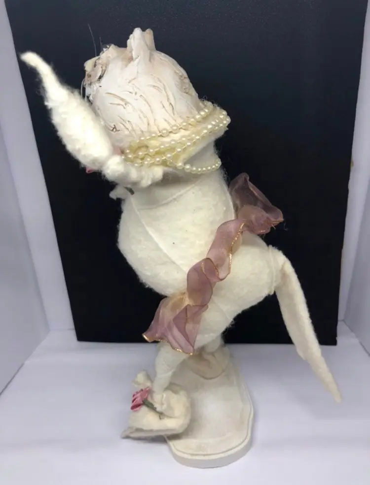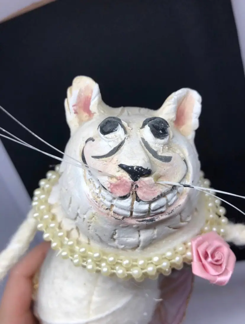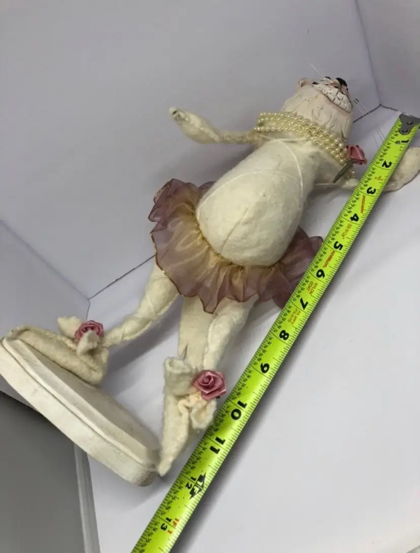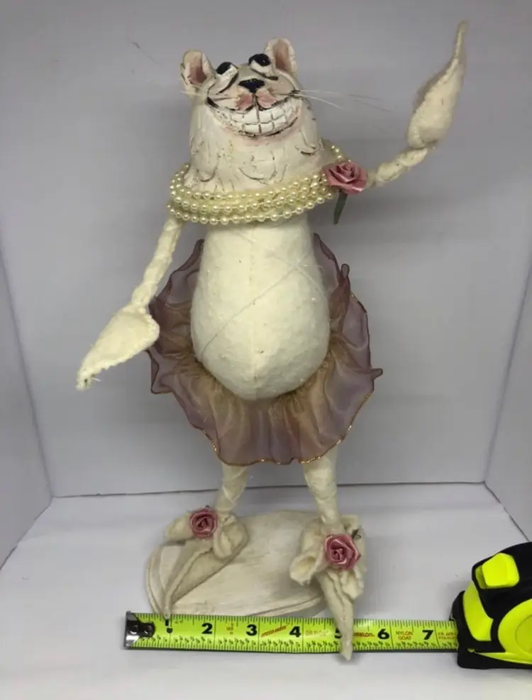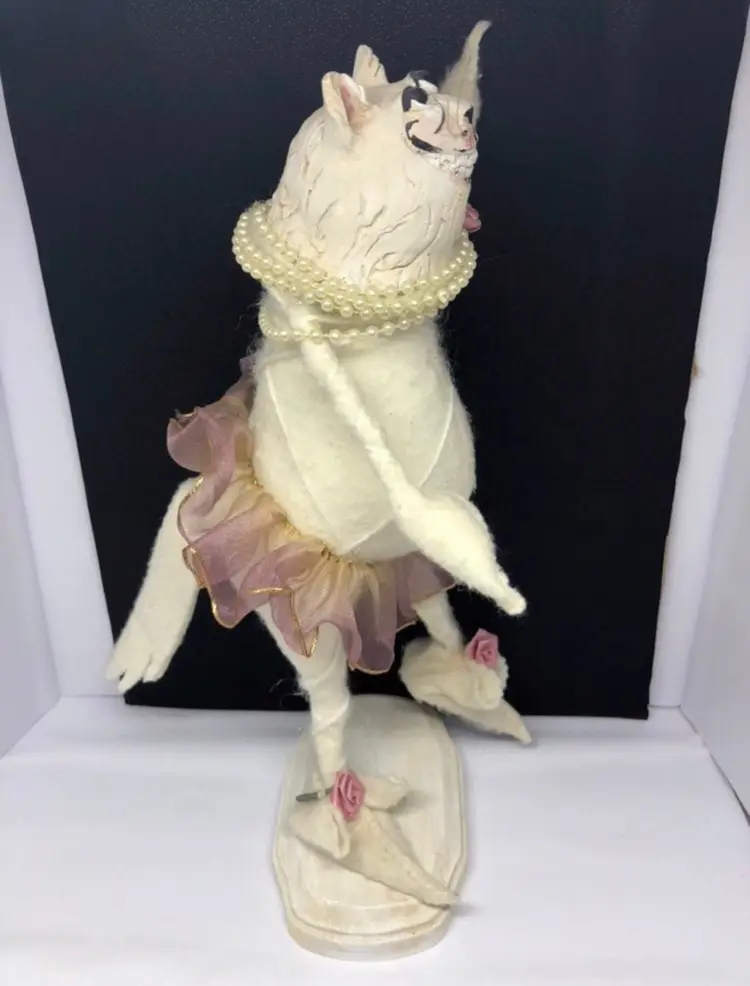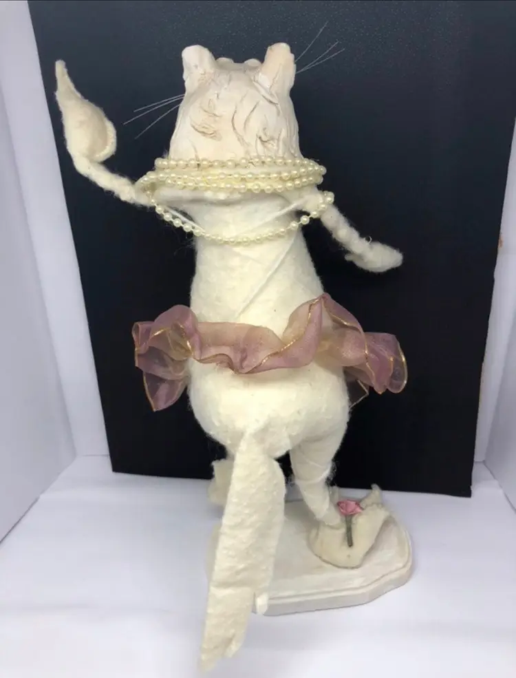 Absolutely gorgeous Stands on a wooden stand Has metal inside and is poseable Someone made this by hand Very unique and neat Great for cat lovers, unique collectors, ballerinas, and many more