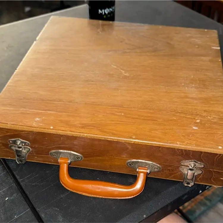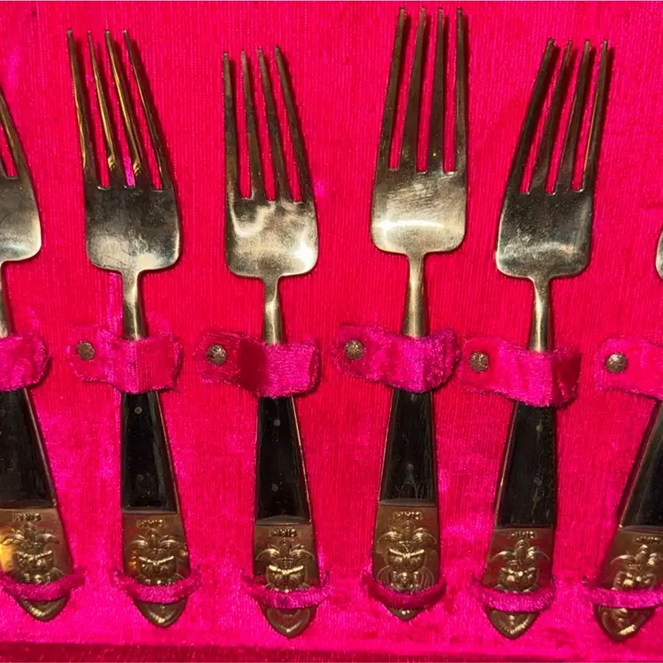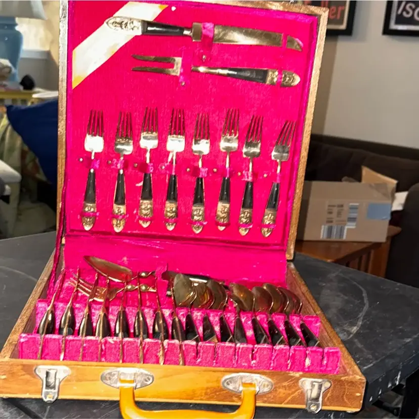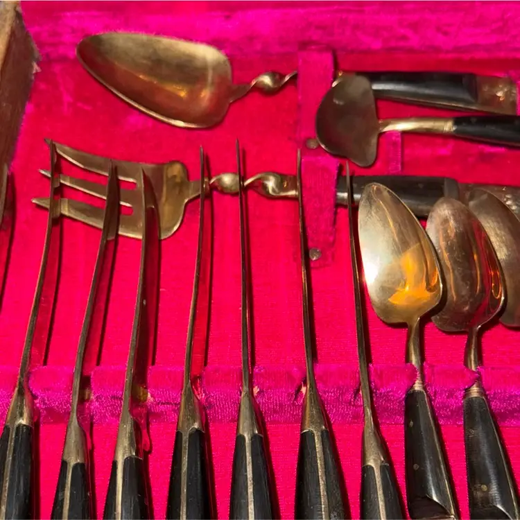 🕰 Narrowing Down the Age • The use of bakelite/early plastic handles + velvet-lined wooden case suggests late 1940s–1950s production. • By the mid-1960s, melamine and stainless steel were more common, and presentation cases shifted to different styles. • The ornate floral/crest design on the brass/gold-plated cutlery is very much a post-war mid-century giftware look.