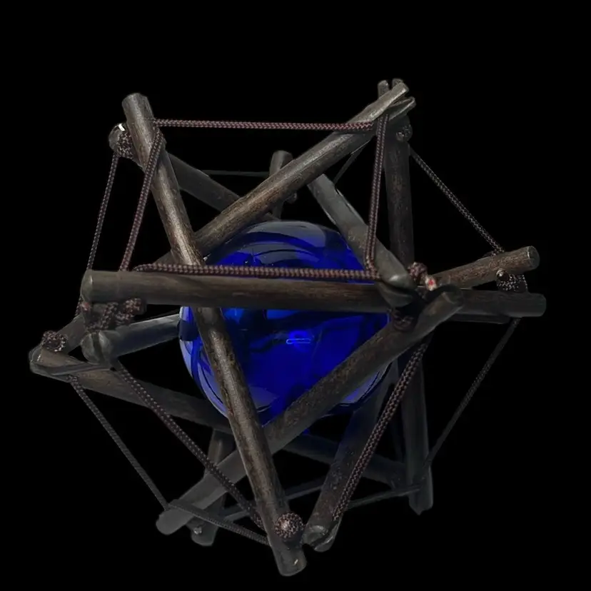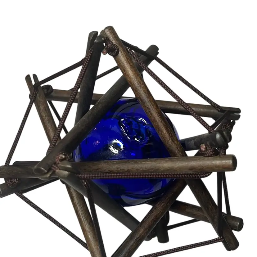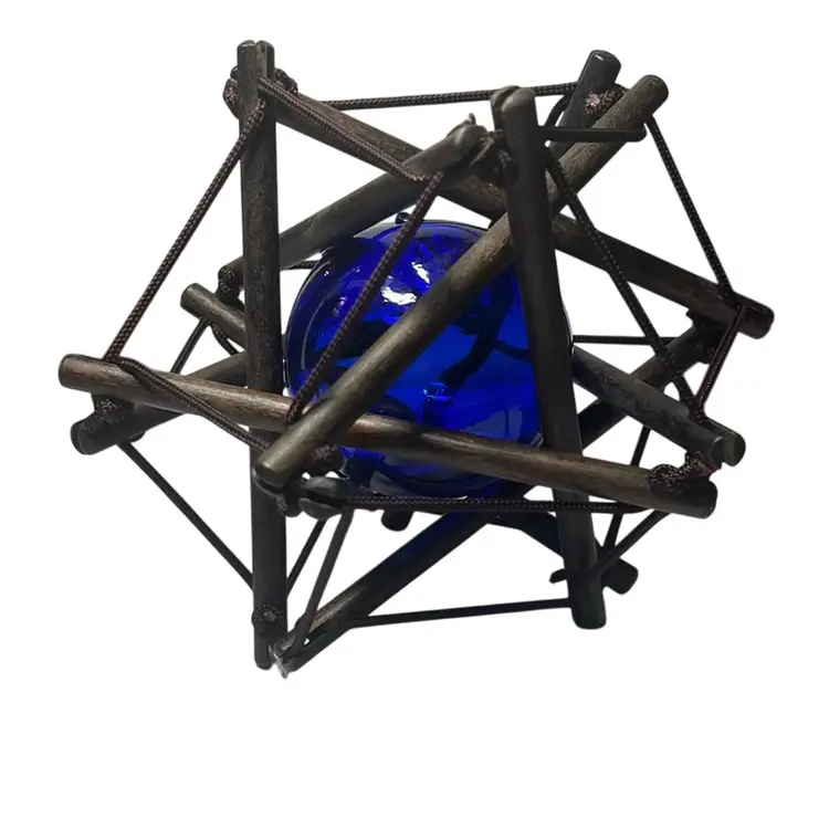 It is a 3 D puzzle - has a hand blown glass orb cobalt blue in the center trapped inside an intricate cage made of wooden dowels & rope. The idea is to separate the glass from the cage. *** also would make a great display piece and conversation starter. Was made in 1970’s by Futuristic production Measures 5” tall & 8” wide