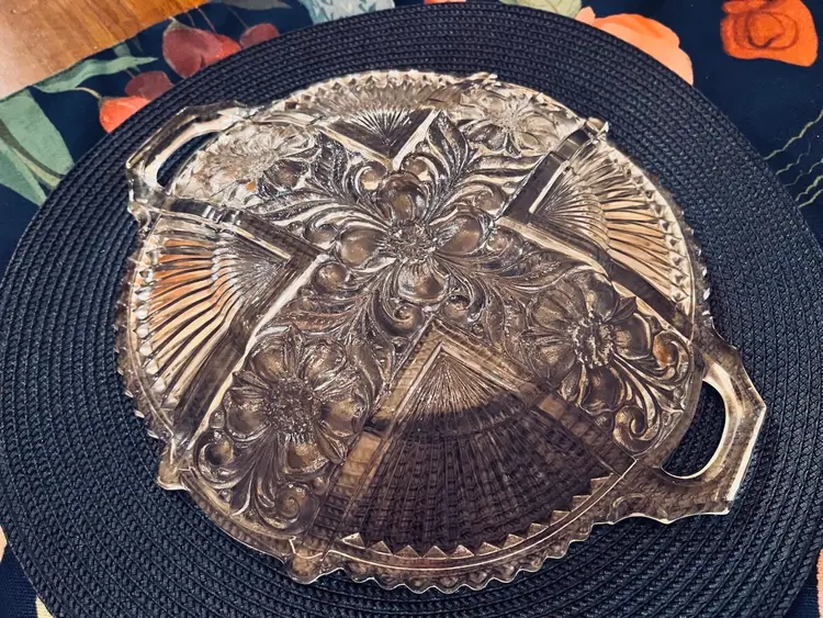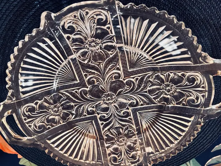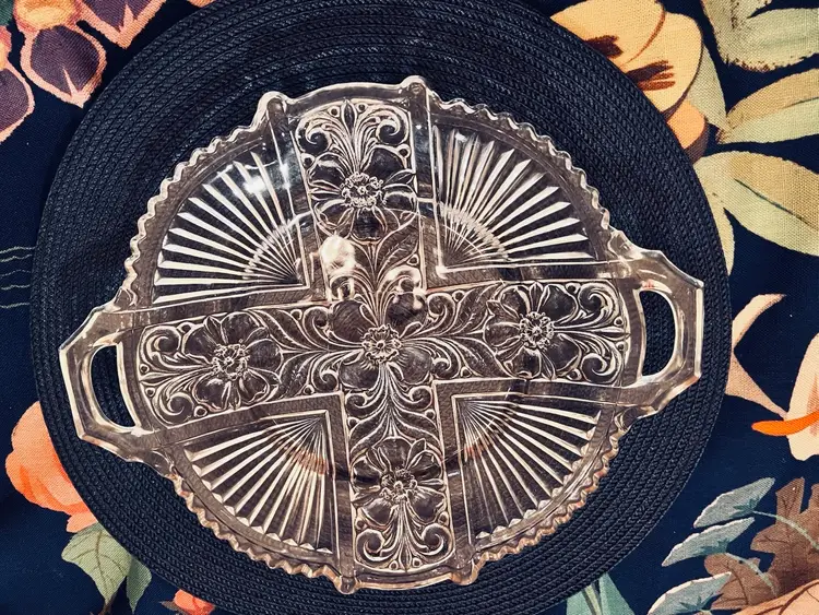 Unique Serving Plate with Cross Design and Handles. 10in circumference and handle to handle is 12in. Weighs 1b 14.7oz. I can feel a small chip blended into the bottom (pictured)