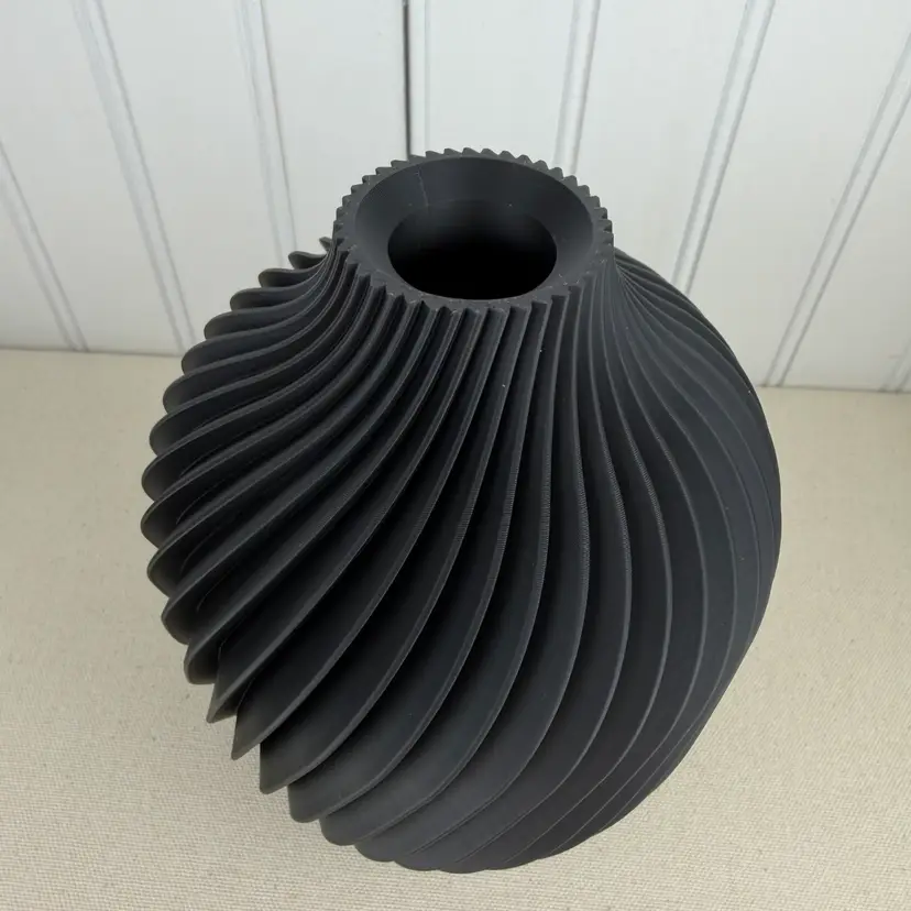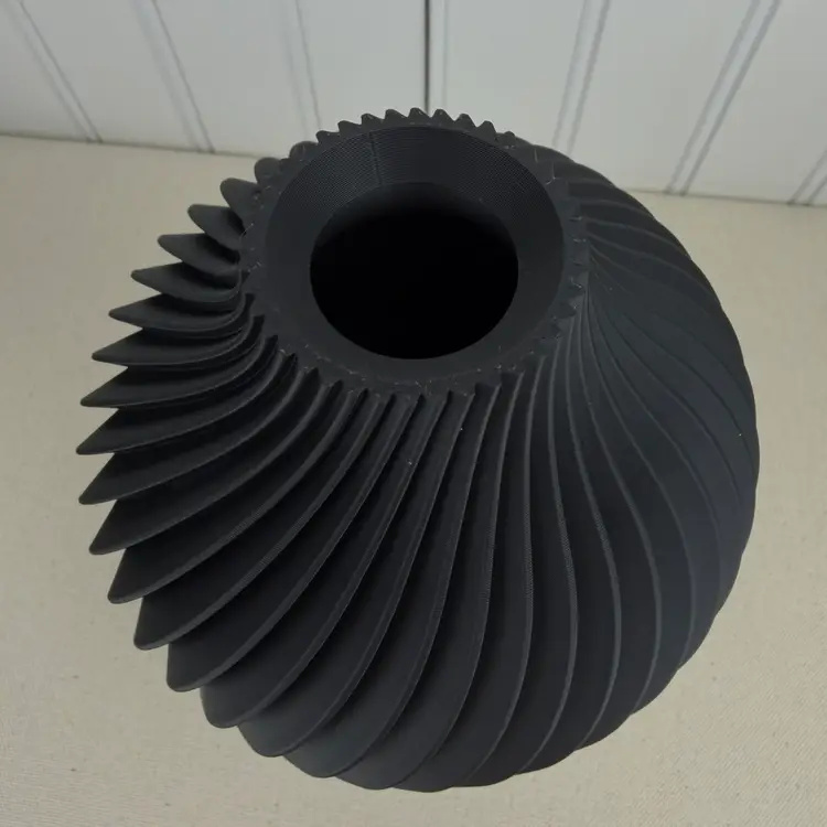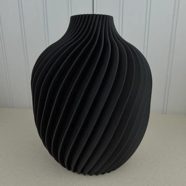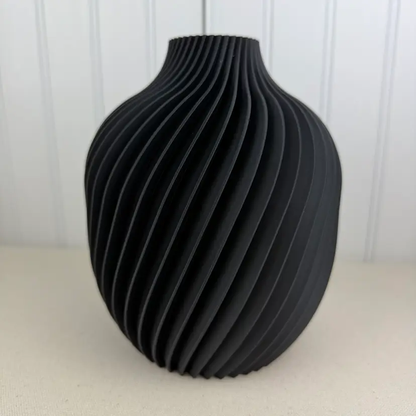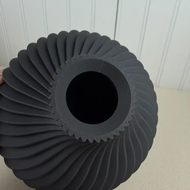 The vase is 3D printed using PLA plastic filament. 3D printing is done by printing layer upon layer of filament to build up and create the print.