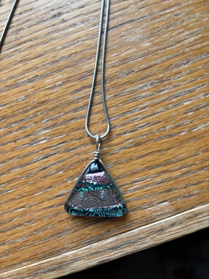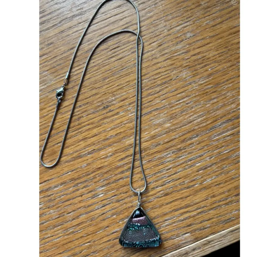Beautiful necklace featuring a triangular glass pendant. Silver chain. Intricate design. Unique statement piece. Great for everyday wear or special occasions. 19” long.