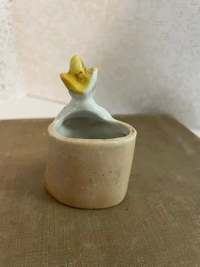 Unique vintage Figure likely from the 1950s. It is in keeping with the ceramics created in that time period. A collecting book mentions that items like this were used for serving sauce or syrup on the table.