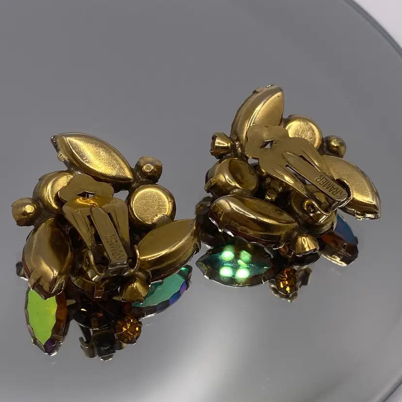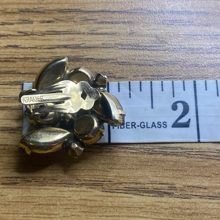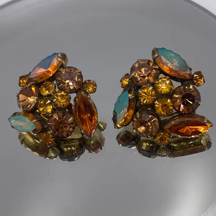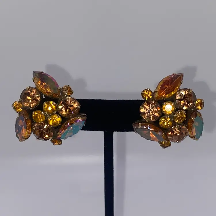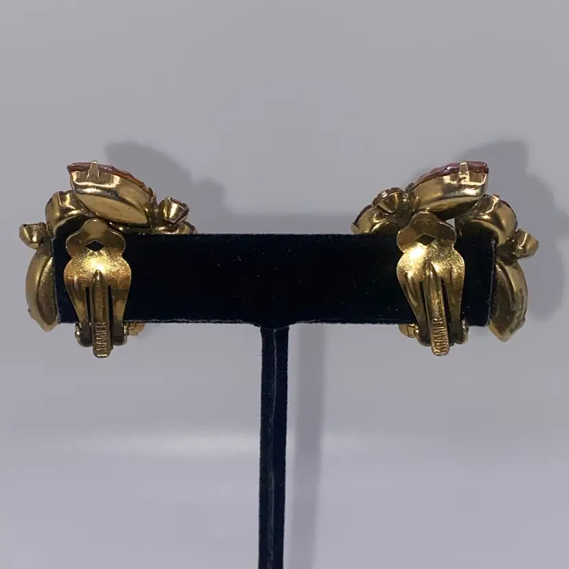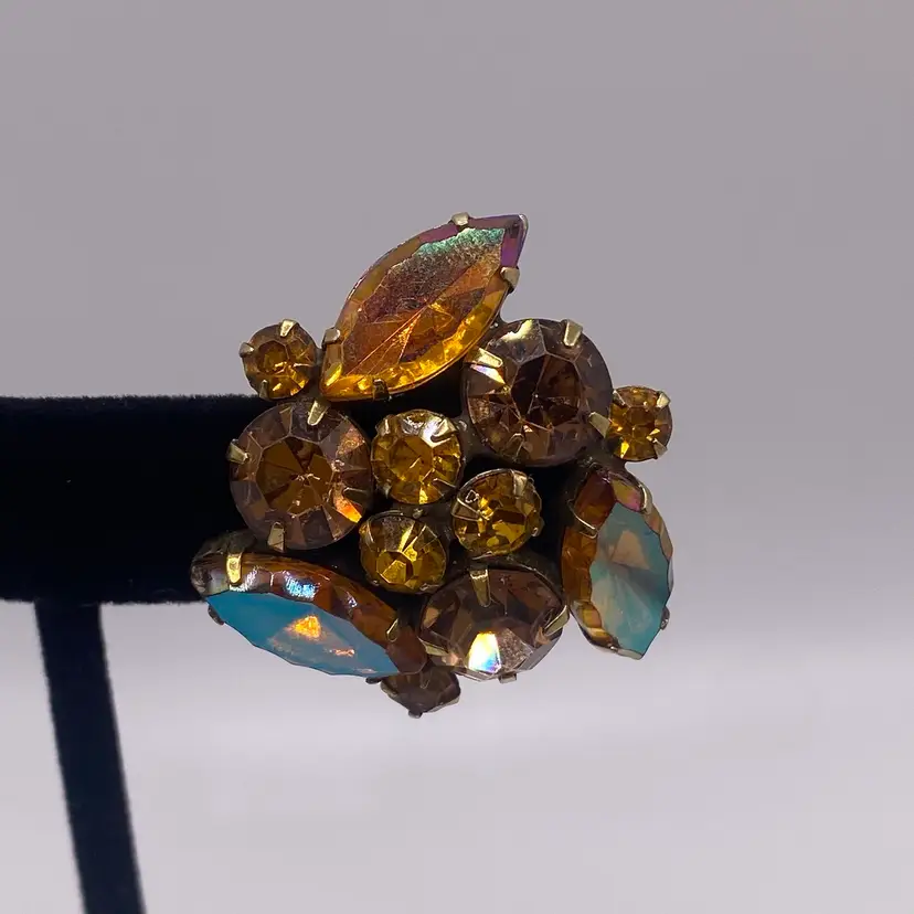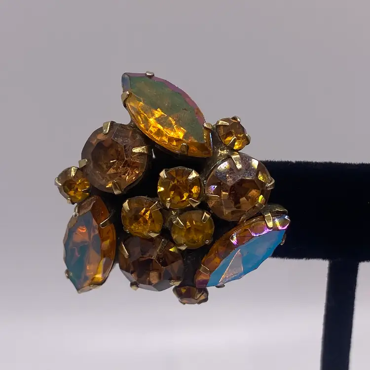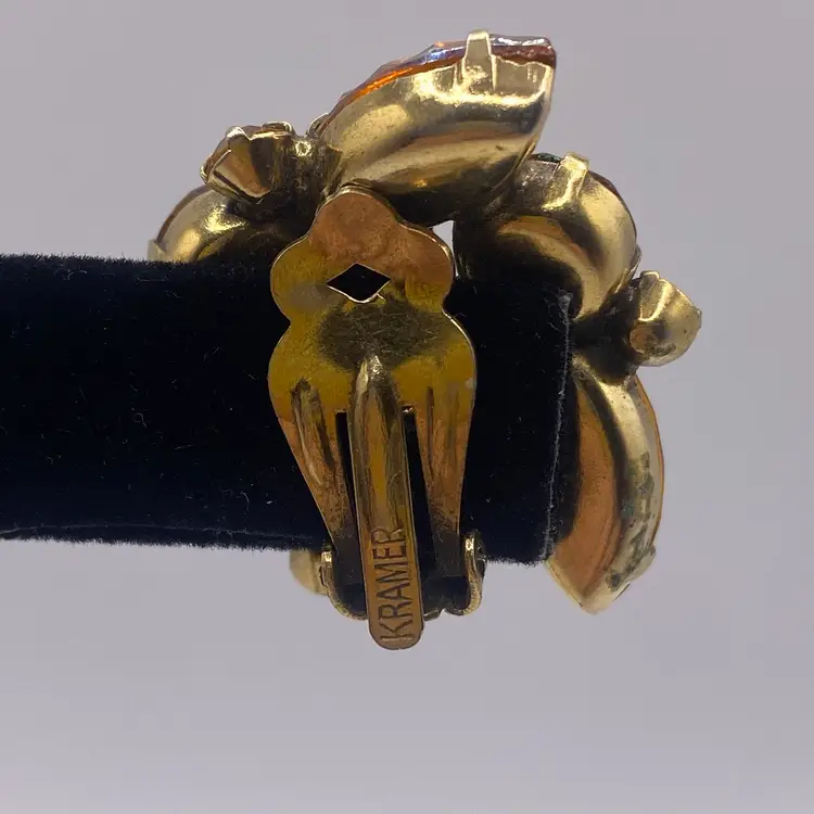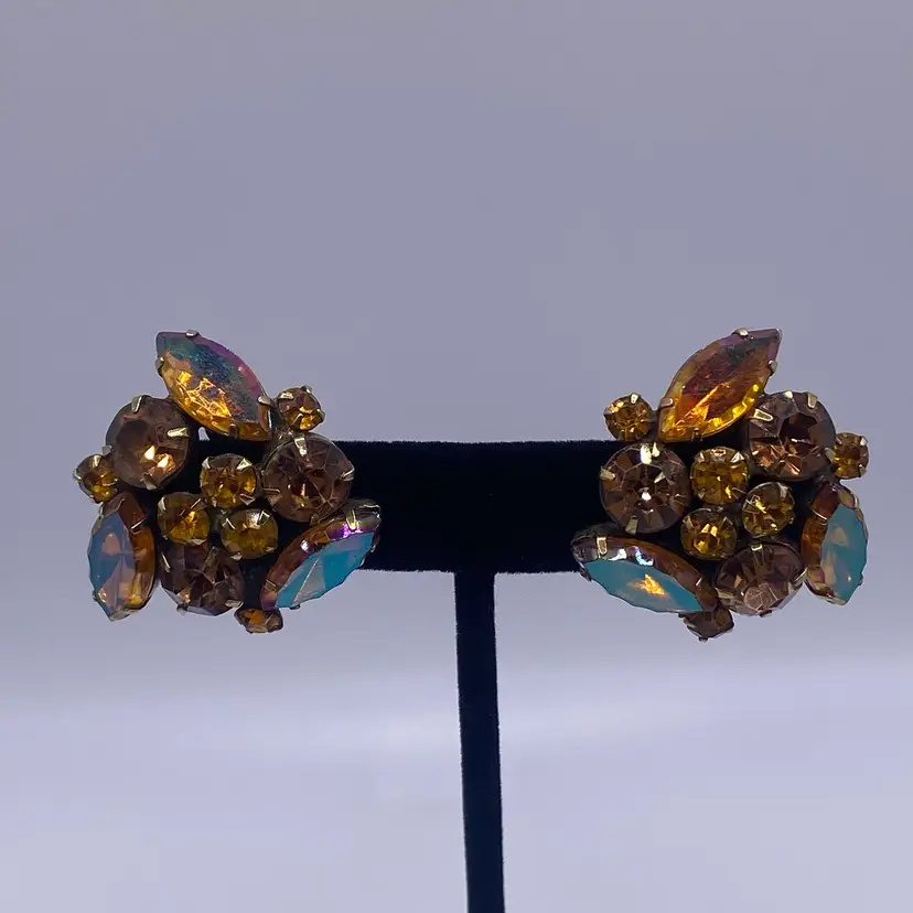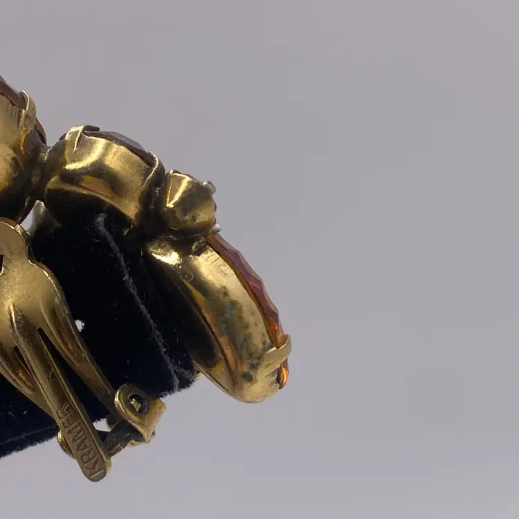 Add a touch of vintage beauty to your outfit with these unique Kramer earrings. The triangular shape and clip-on closure make them perfect for both casual and formal occasions. The earrings feature a stunning rhinestone cluster in a topaz/purple color, which adds a pop of color to any outfit.
