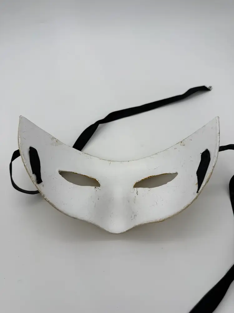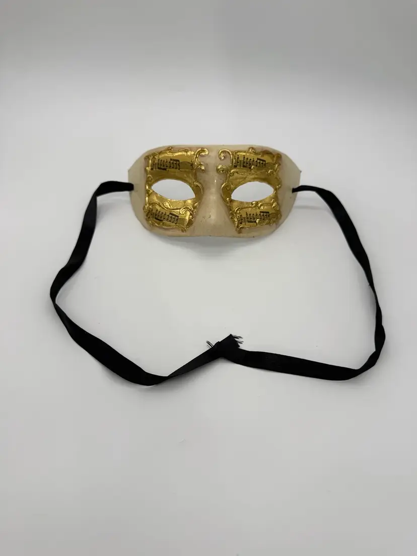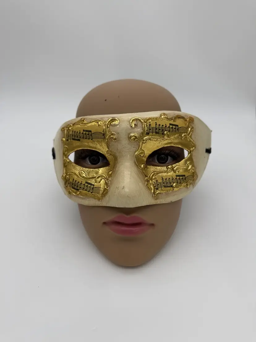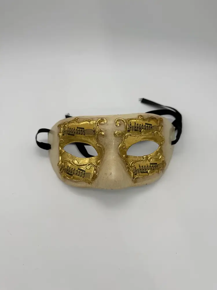 This handmade paper mache Mardi Gras mask features a unique design with music notes and a Venetian half mask style. The beige and gold color scheme adds a touch of elegance, making it suitable for costume parties, Mardi Gras events, or theatrical performances. The adjustable strap ensures a comfortable fit for adult unisex wearers looking to add a touch of vintage charm to their ensemble. Made from plastered paper mache, this mask combines artistry and craftsmanship to create a standout accessory for any occasion.