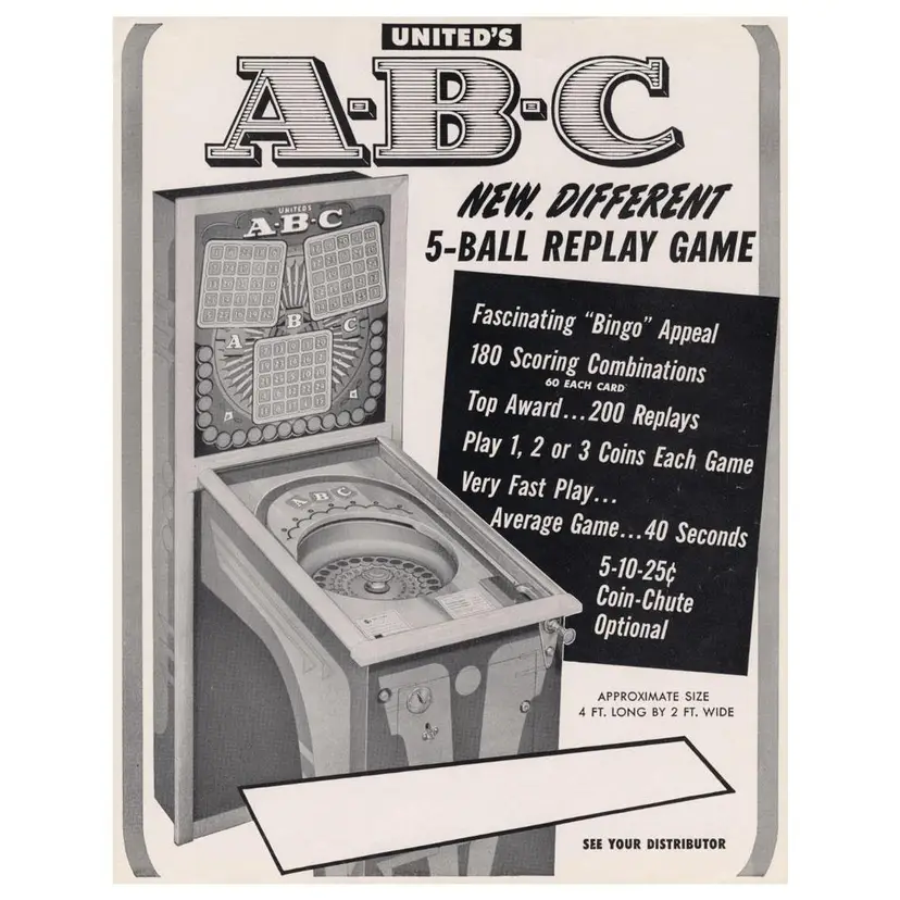 United ABC Arcade Game Flyer 1951 Original Bingo Pinball Machine Vintage Artwork