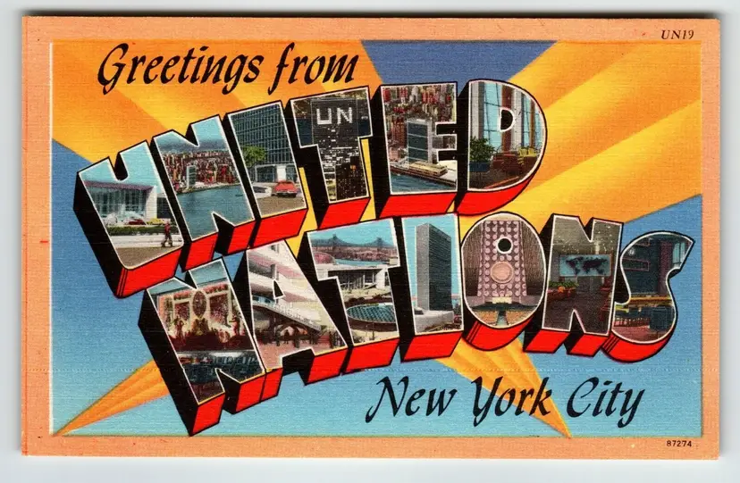 Number of Items in Set: 1 Unit of Sale: Single Unit Artist: Unknown Occasion: Sayings & Quotes Size: Standard (5.5 x 3.5 in) Signed: No Custom Bundle: No Year Manufactured: 1951 Material: Paper City: New York City Original/Licensed Reprint: Original Franchise: None Brand/Publisher: Acacia Subject: United Nations Continent: North America Type: Linen Postcard Era: Linen (1930-1945) Region: New York Country: USA Theme: Agriculture, Architecture, Big Letter, Block Letters, Cities & Towns, Famous Places, Greetings, Large Letter, Social History, Tourism, Travel Features: Divided Back, Large Letter Postcard, Cities, Towns Time Period Manufactured: 1930's-1950's Country/Region of Manufacture: United States Postage Condition: Unposted