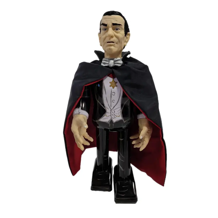 Rare robot exceptionally well detailed in every way. Great wind-up mechanical action and Dracula comes complete with a cape, metal key, and inner pouch for his coffin. Pre-owned in working condition comes with original box and packaging