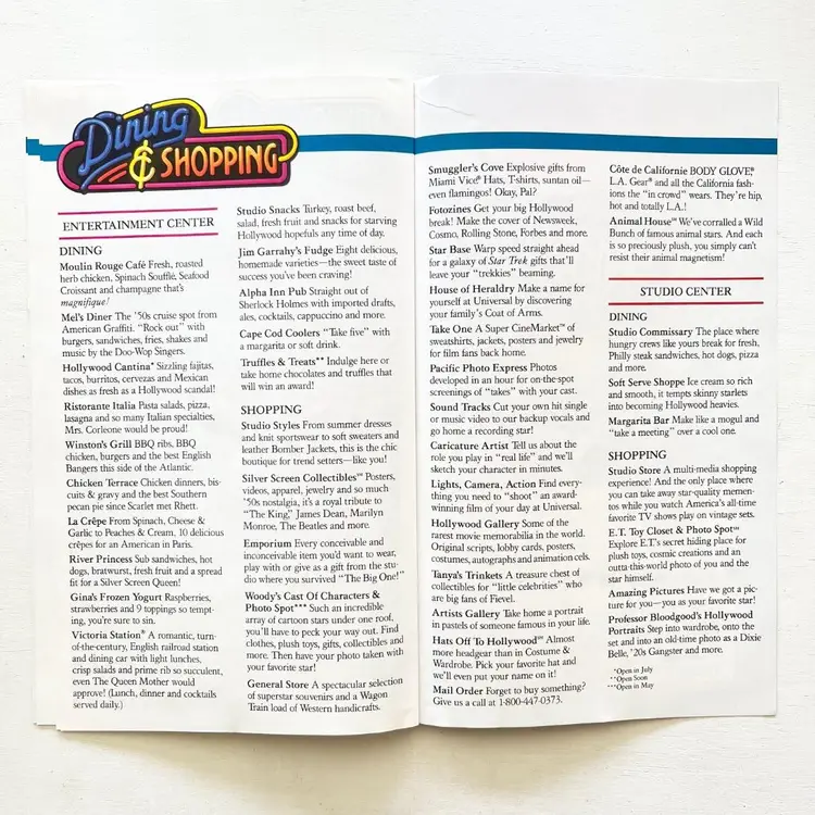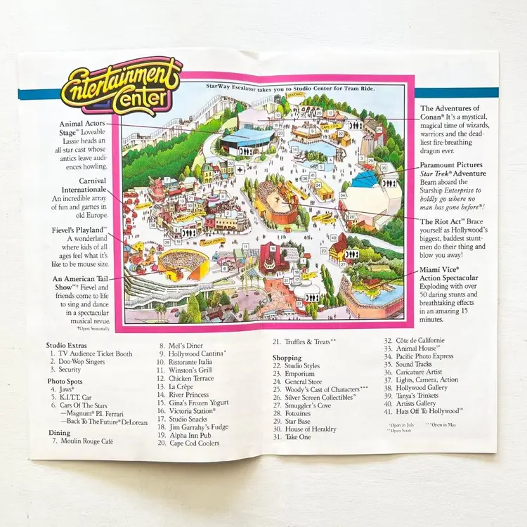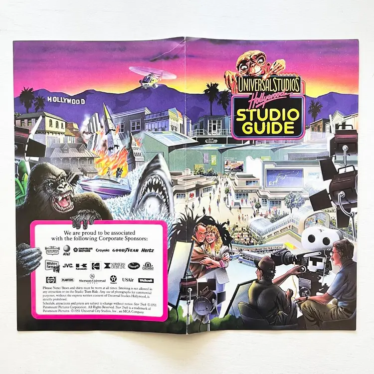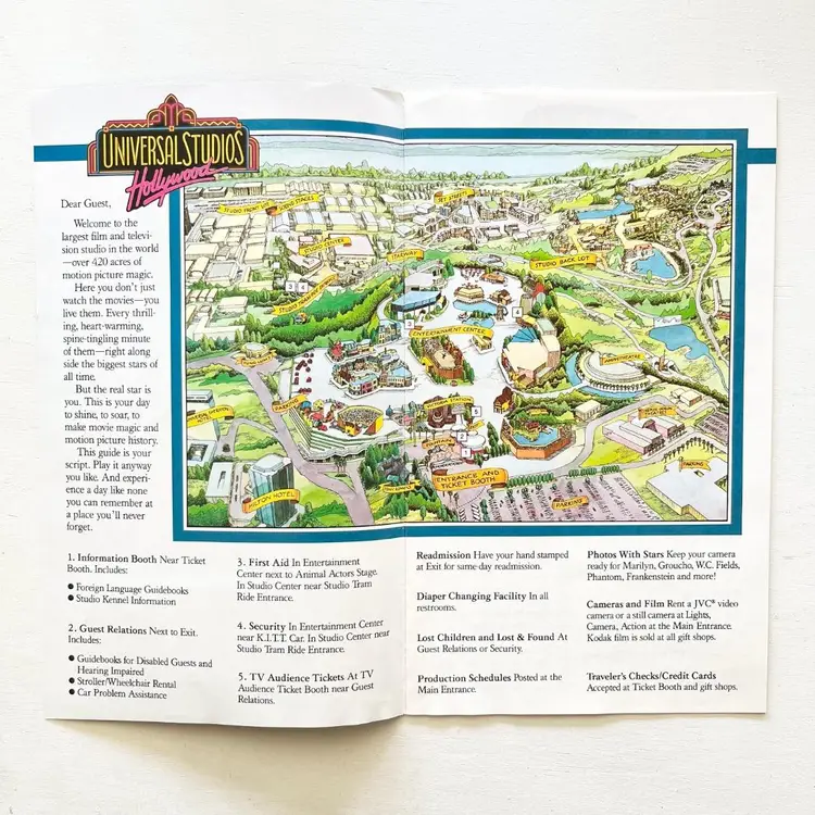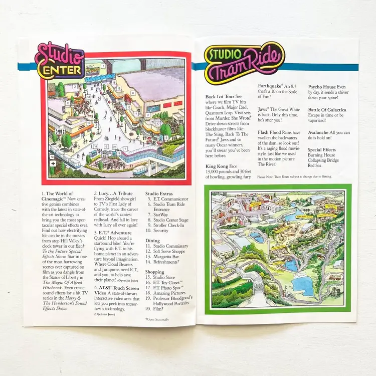 Universal Studios Hollywood Guide Map Pictorial Booklet Vintage 1990s Universal Studios Guest Guide A book of maps to the largest film and television studio in the world with over 420 acres of motion picture movie magic Entertainment Center: Animal Actors Stage, Carnival Internationale, Fievel's Playland, An American Tail Show, The Adventures of Conan, Paramount Pictures Star Trek Adventure, The Riot Act, Miami Vice Action Spectacular Studio Center: The World of Cinemagic, Lucy A Tribute to Lucille Ball, ET Adventure, AT&T Touch Screen Video, Studio Extras, Dining, Shopping Studio Tram Ride: Back Lot Tour, King Kong, Earthquake, Jaws, Flash Flood, Psycho House, Battle of Galactica, Avalanche, Special Effects of Burning House, Collapsing Bridge and Red Sea 10-Page Booklet (Including Covers) Condition: Wear on the corners, spine Measures 8-1/4 inches x 5 inches Packaged in a plastic sleeve inside a rigid envelope Visit my store to see more vintage ephemera, advertising, novelties, gifts, estate sale and yard sale finds https://district.net/u/finderspickerspaper SKU B31