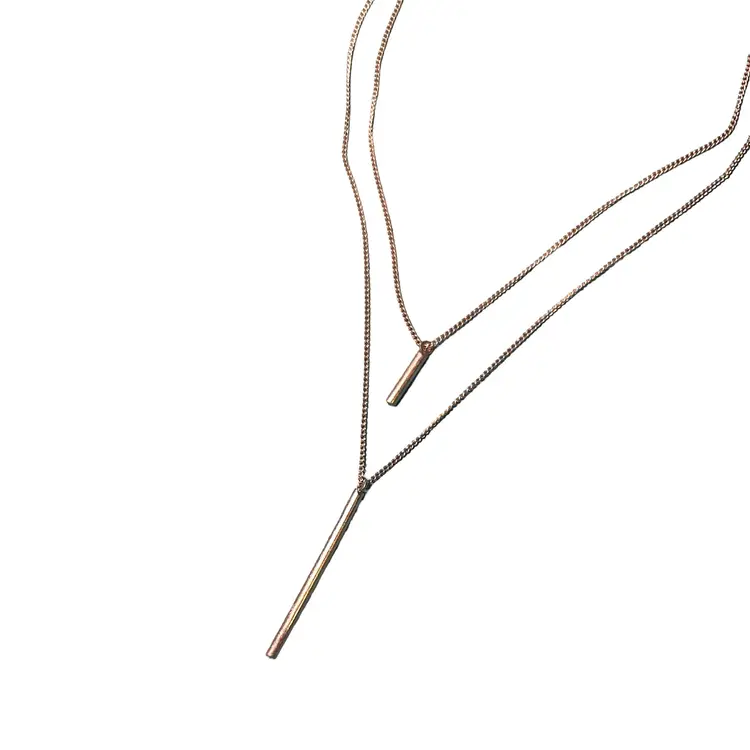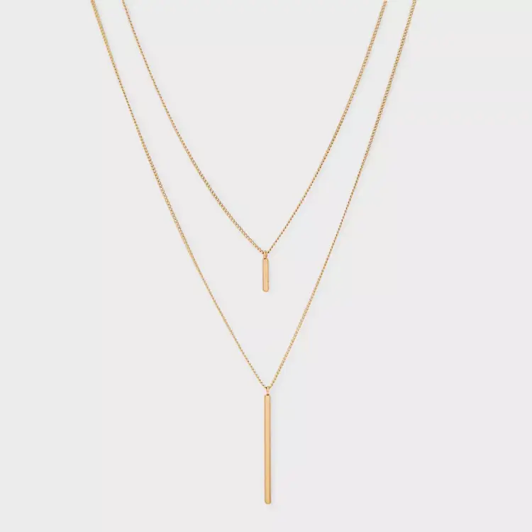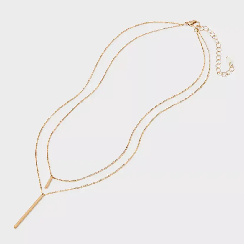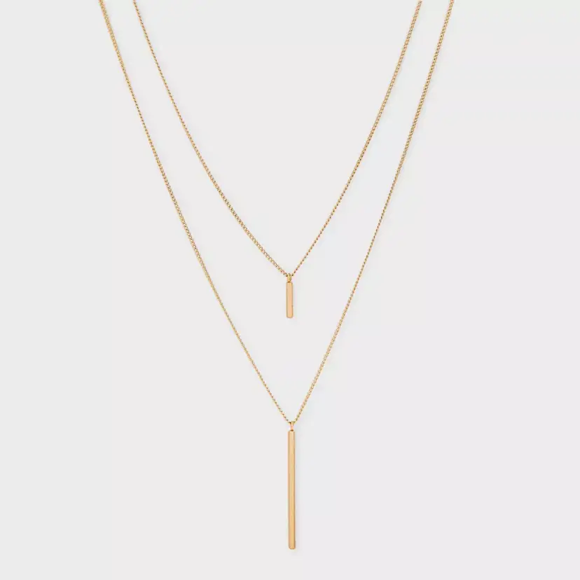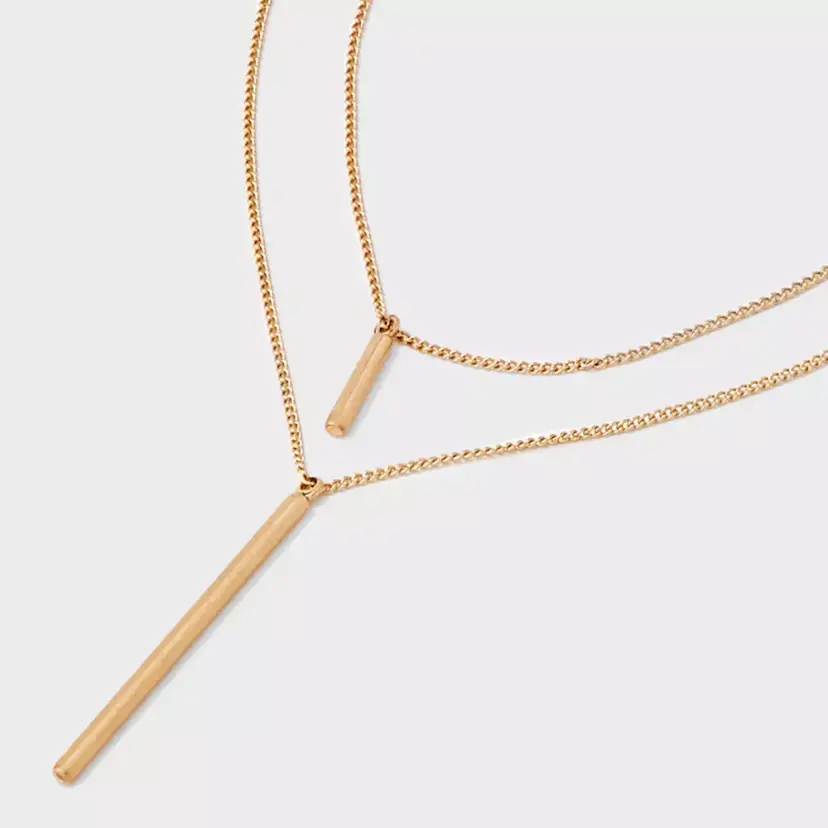 Features a gold-tone double chain design with sleek vertical bar pendants for a modern minimalist look.