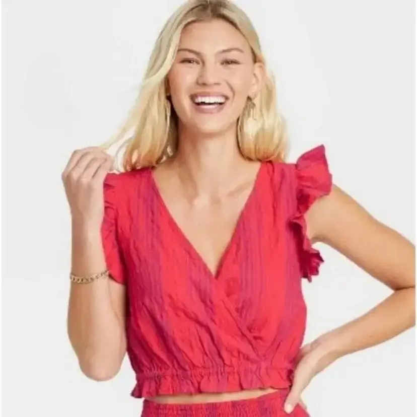 Sweeten your warm-weather look with the Flutter Short-Sleeve Cropped Wrap Top from Universal Thread™. Thanks to its 100% cotton construction, this printed top is soft, breathable and comfortable, and it's cut to a cropped length with an elastic-cinched ruffled hemline for a frilly finish, which is complemented by the flutter sleeves. You'll love the flattering V-neckline with a wrap-style design that elevates your fashion sense even more. This pullover top will look great worn with all of your high-waist bottoms to rock that cute cropped look. Universal Thread™: The denim collection that's true to you. Sizing: Womens Material: 100% Cotton Length: Cropped Garment Style: Sleeveless, Pullover Fit: Classic Fit Neckline: V Neck Garment Details: Front Elastic Garment sleeve style: Flutter Sleeve Care and Cleaning: Machine Wash & Tumble Dry Size XL BNWT - no flaws Measurements taken flat: Armpit to armpit: 20" Shoulder to hem length: 20"