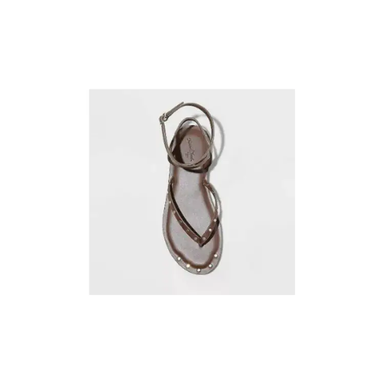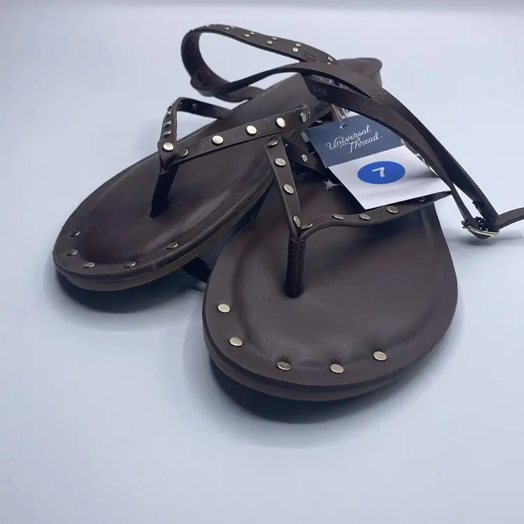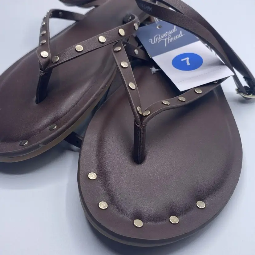 •Universal Thread studded thong sandals •Open toe and back •Heel strap with buckle •Textured outsole •Brown color