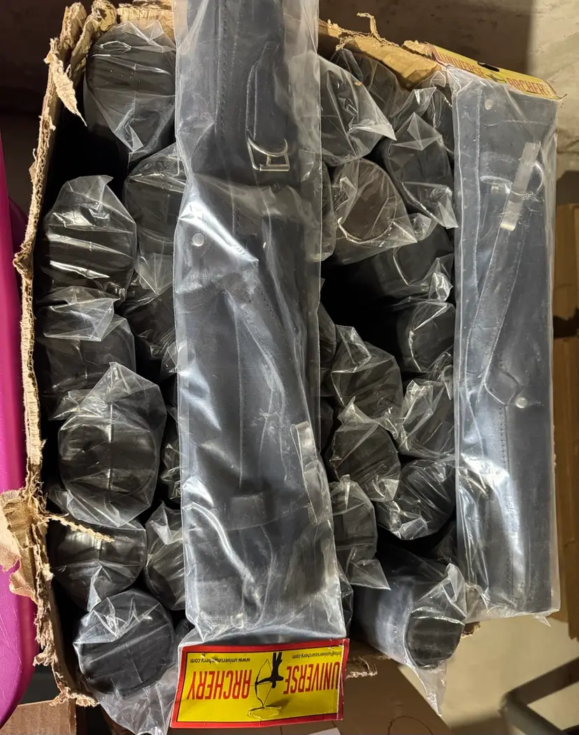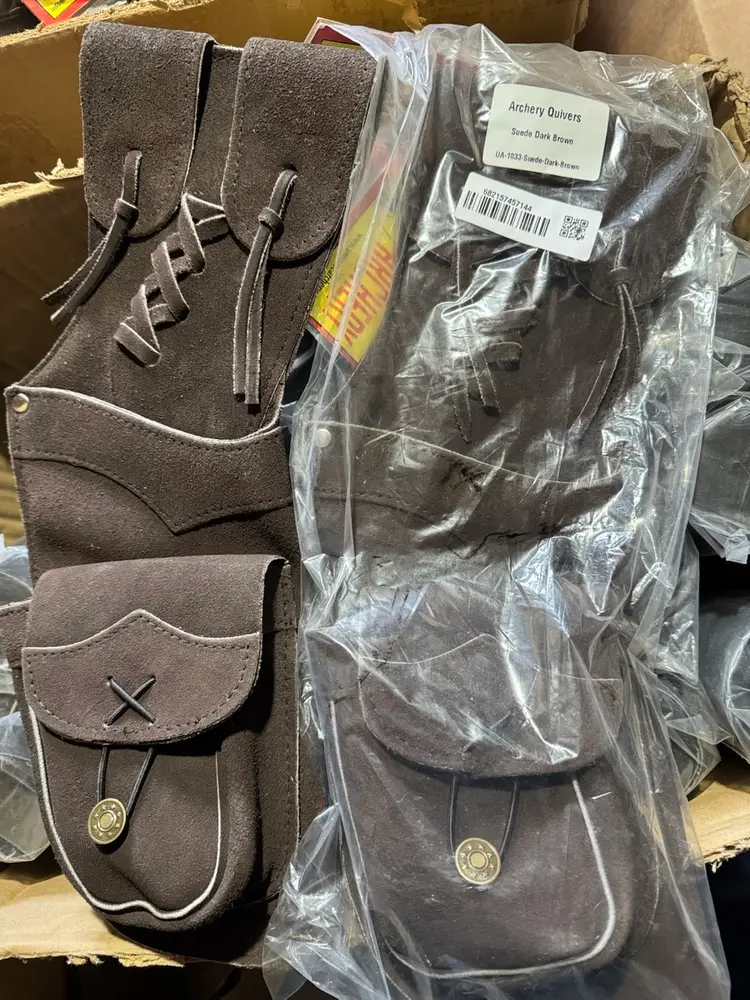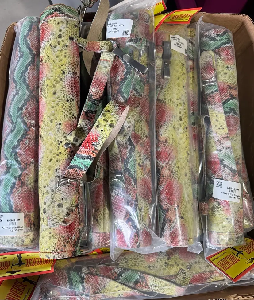 4 colors/varieties available. All of them are suede leather. The black, leopard, and python versions are all round tube shape. The brown are shaped more like a holster. All are new in original packaging, no damage.