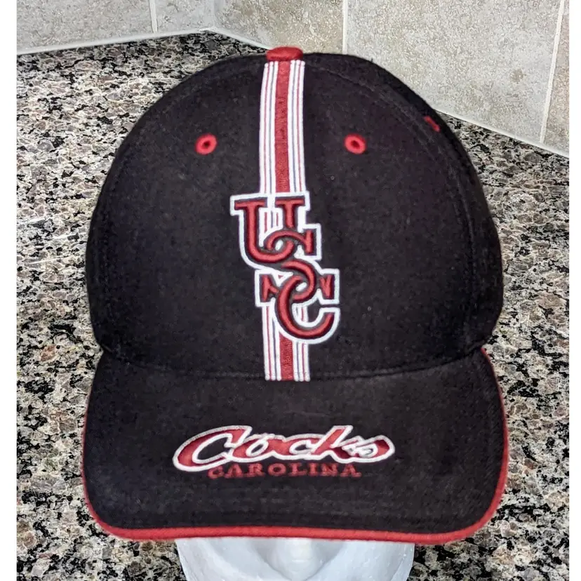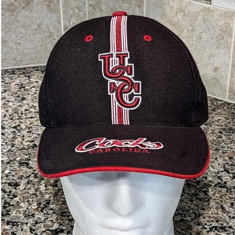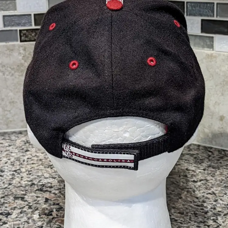 This listing is for a very nice University Of South Carolina Gamecocks Football Black Strapback Wool Blend Hat. Officially licensed by Twins Enterprises. Really soft nice wool blend. Adjustable strap says South Carolina across it. Fits mosts heads. Very cool look And rare collectible that says "Cocks" across the brim. Can't find this stuff anymore with the schools mascot change!