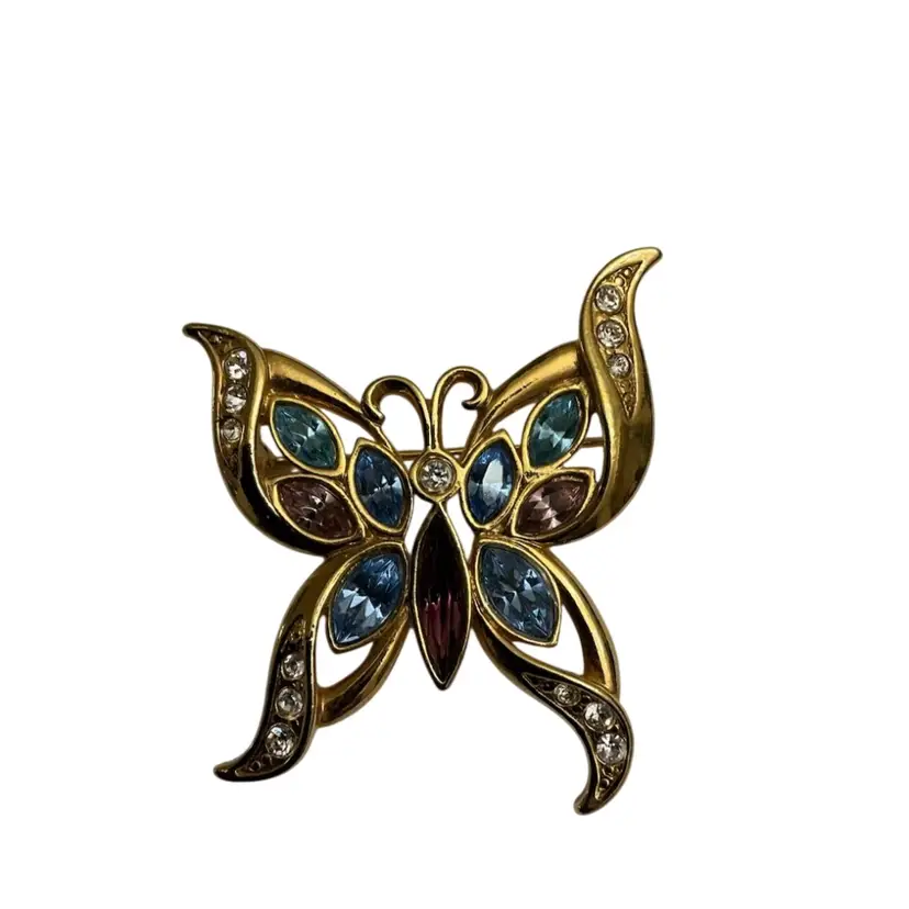 Beautiful gold-toned brooch with blue/clear and purple rhinestones.