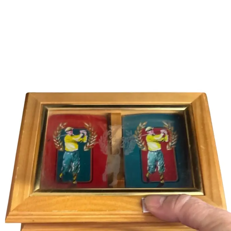 Vintage set of golf themed playing cards housed in a wooden box with a glass top for viewing the reverse colors on each deck!The cards feature a golfer in action and are likely from a "Classic Collections" series. These types of playing cards are often sought after by collectors and golf enthusiasts Mint condition and both decks are still factory plastic wrap sealed!
