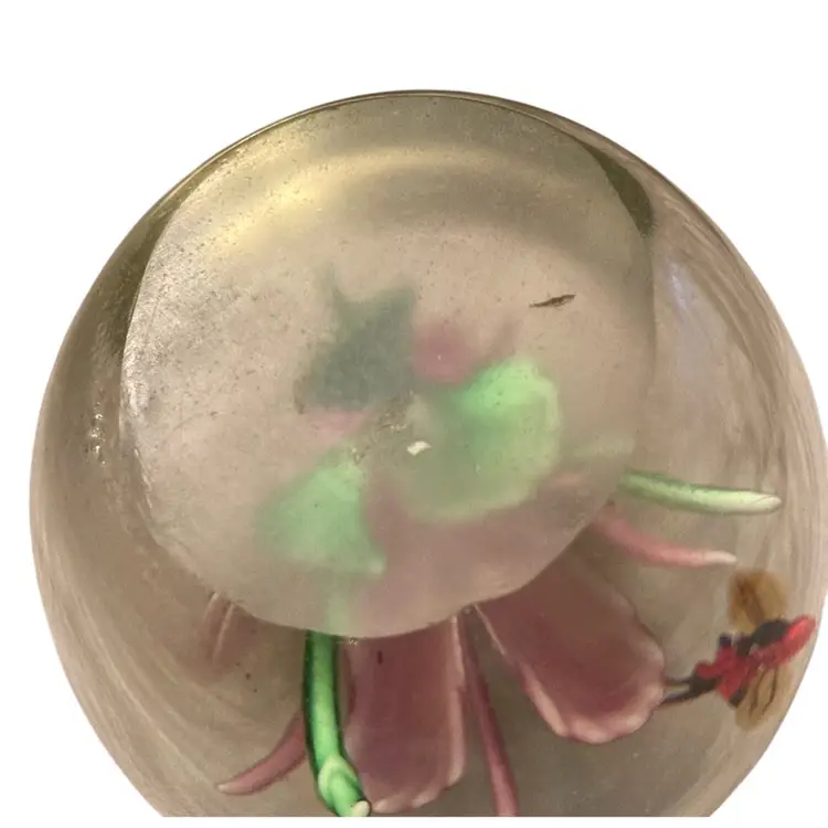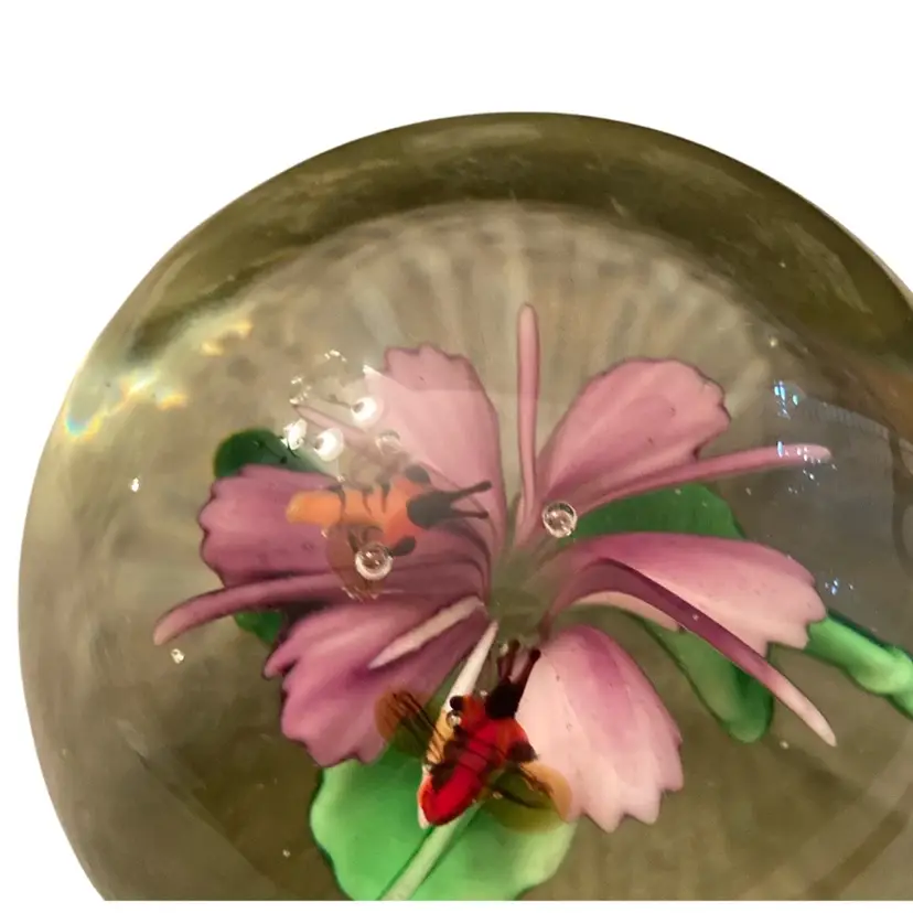 Beautiful 2.5” x 2.5” flower paperweight with two flying bees. Unsigned. No cracks, chips or bruises.
