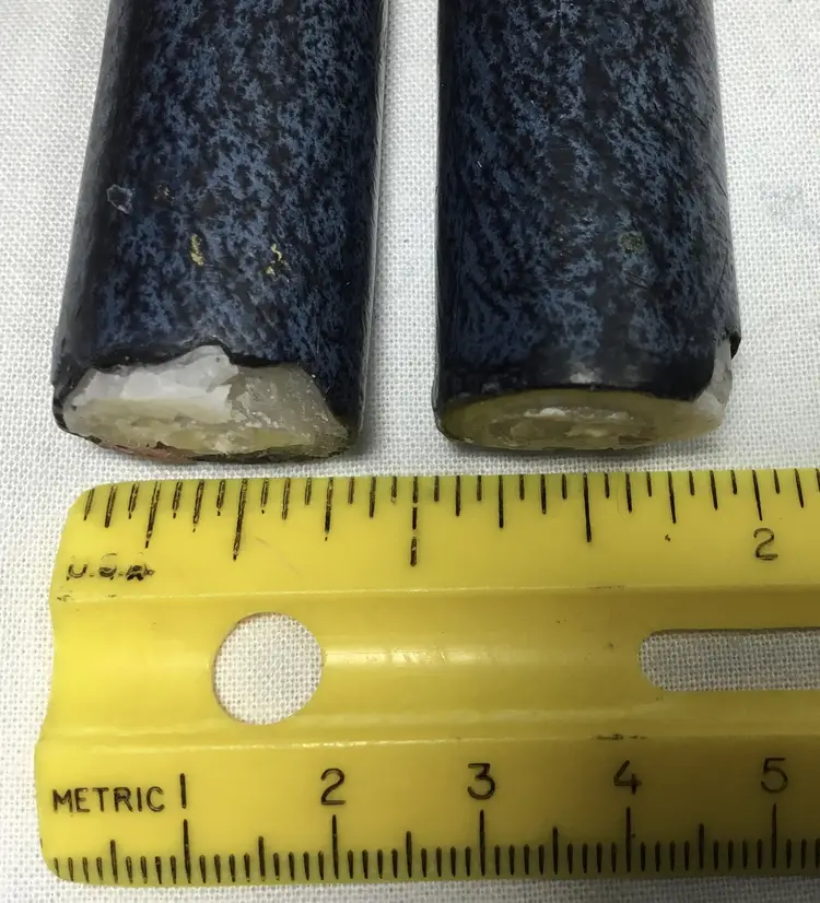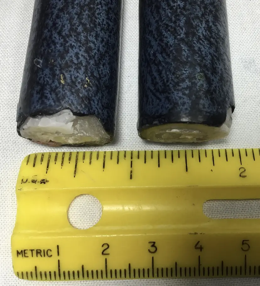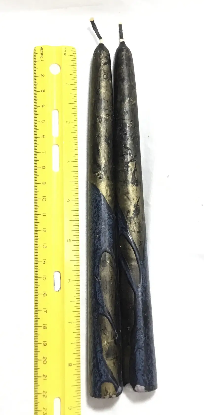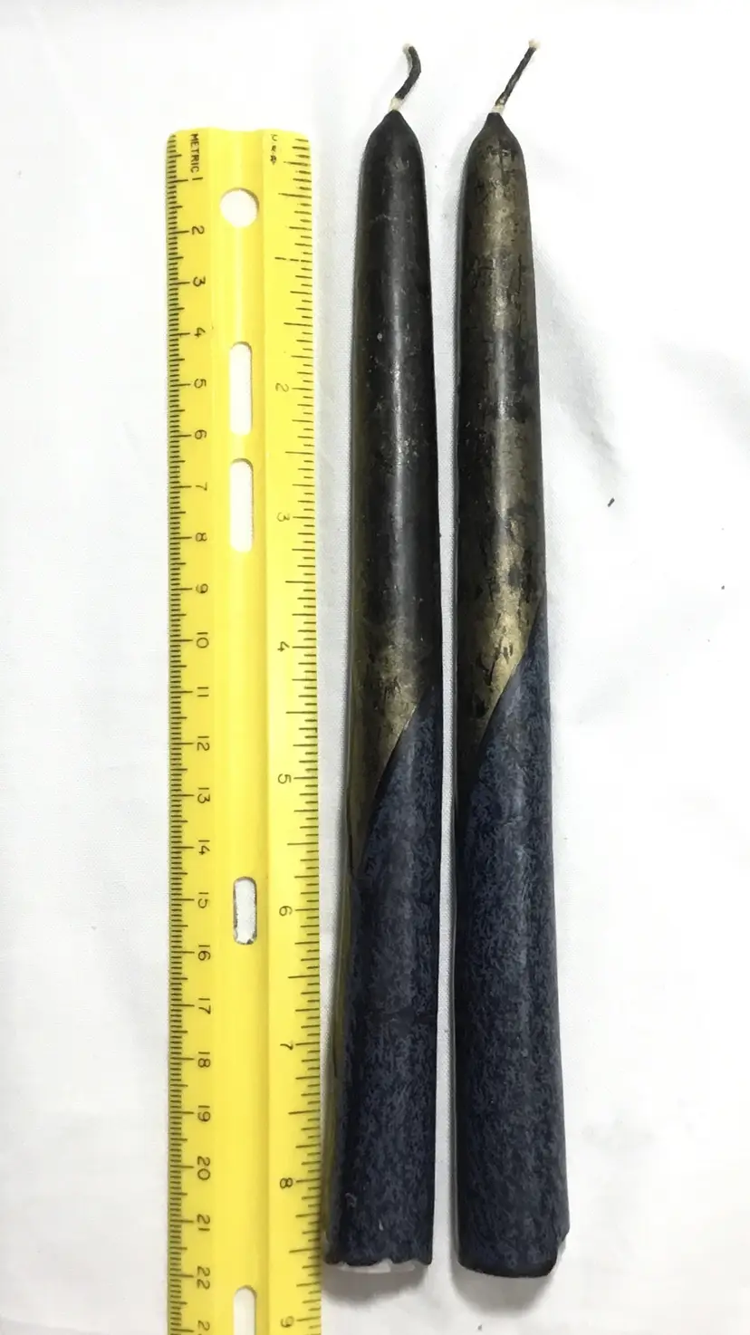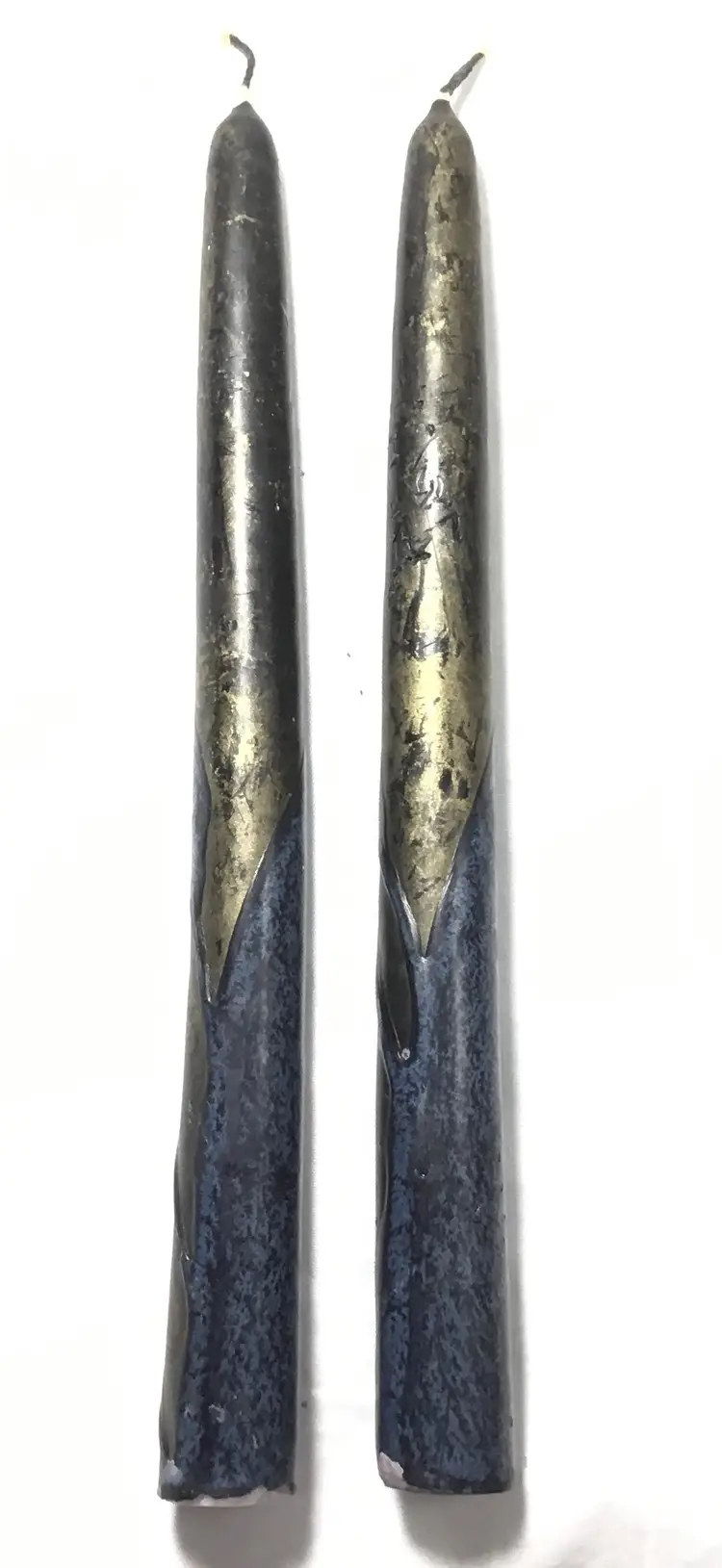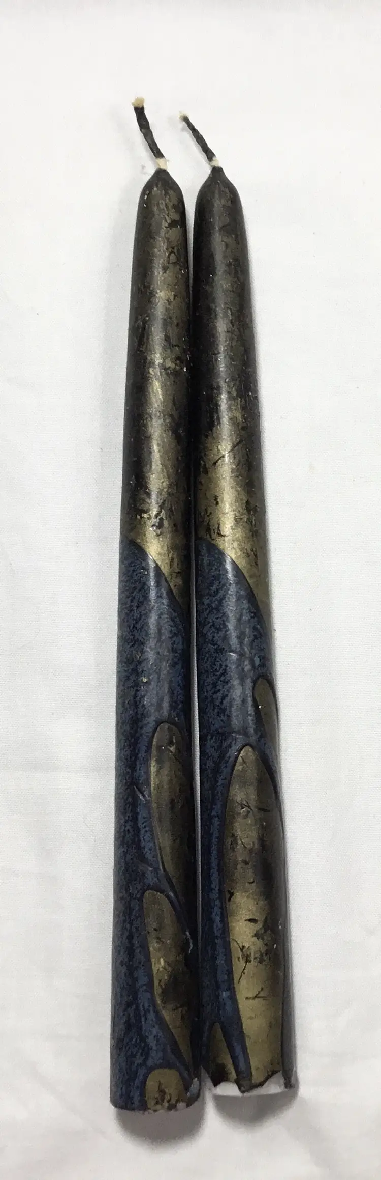 8.5 inches tall, unused taper candles. White wax centers have been dipped in colored wax overlays, black, gold, dark blue. Bottom of candles approx. 7/8 inch wide. Overall dark appearance. One candle is slightly bent.