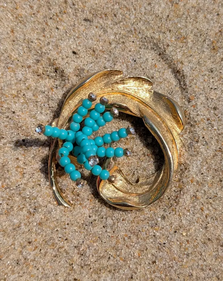 I love the depth and flow of this piece. Turquoise beads are wired in place with each strand topped with a prong-set rhinestone.