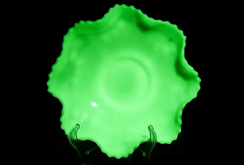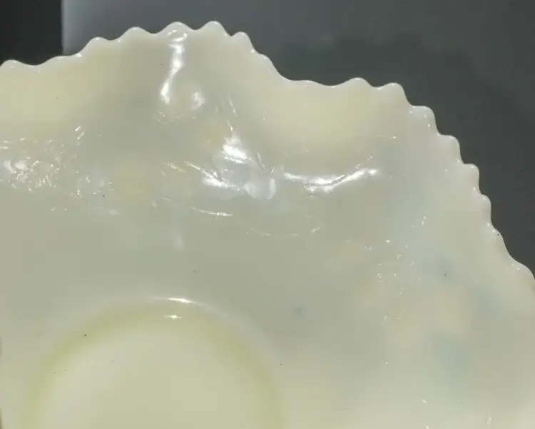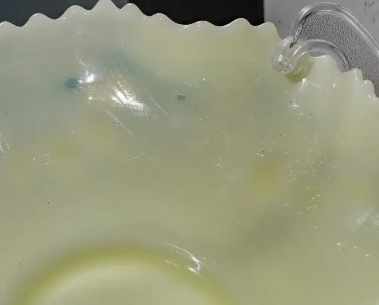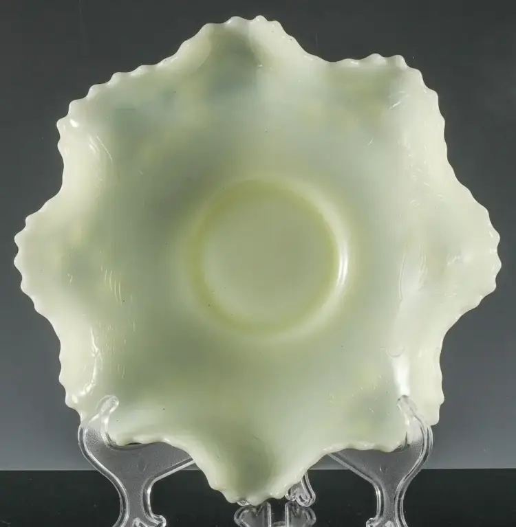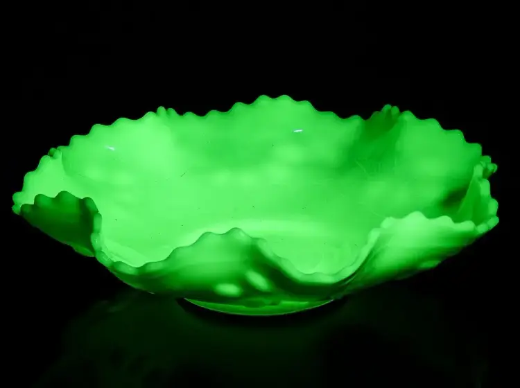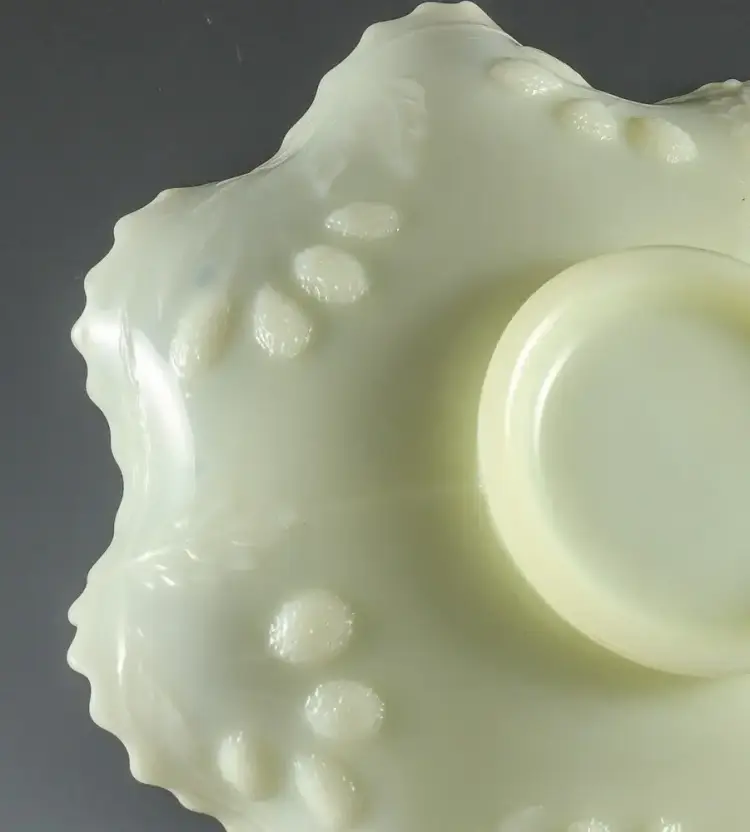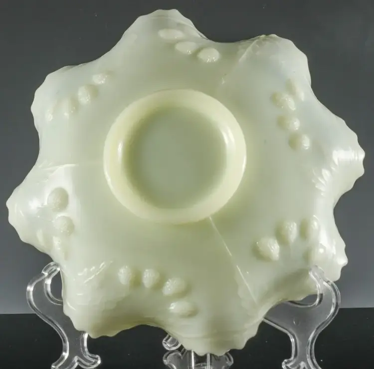 Presented for your consideration is a very fine older Custard color Glass Bowl which is actually Uranium or Vaseline Glass and Glows very brightly under Black Light. The Bowl is very similar to Fenton's Persian Medallion pattern but instead has lovely Bird designs inside the Bowl and Berry patterns molded in relief to the outside of the Bowl. I could not find another like this and not 100% sure it is Fenton, but if it is then it is pre-mark, so probably 50-60 years old.