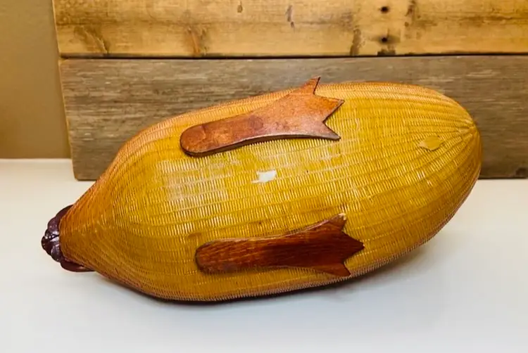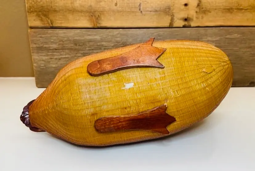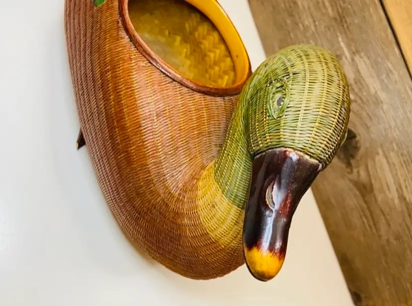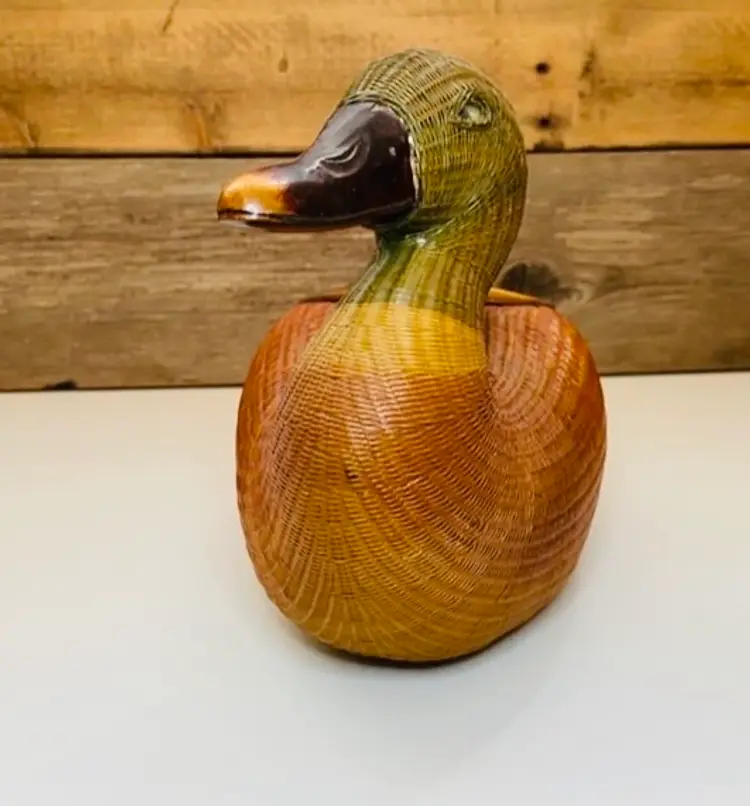 Unusual vintage Asian wood carved duck storage box, I believe it is missing the cover. Fabulous decor item and stash box all in one. It is well made with fabulous colors. Good to keep things in or florals would look great in it. In good used condition. HIs feet are a little scuffed (see pic).