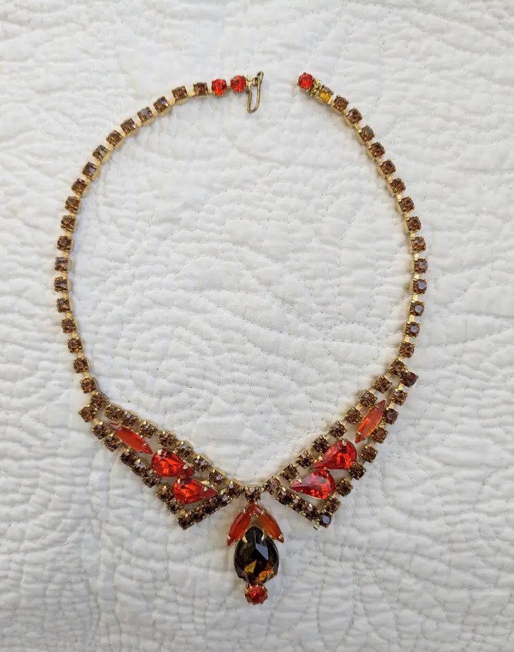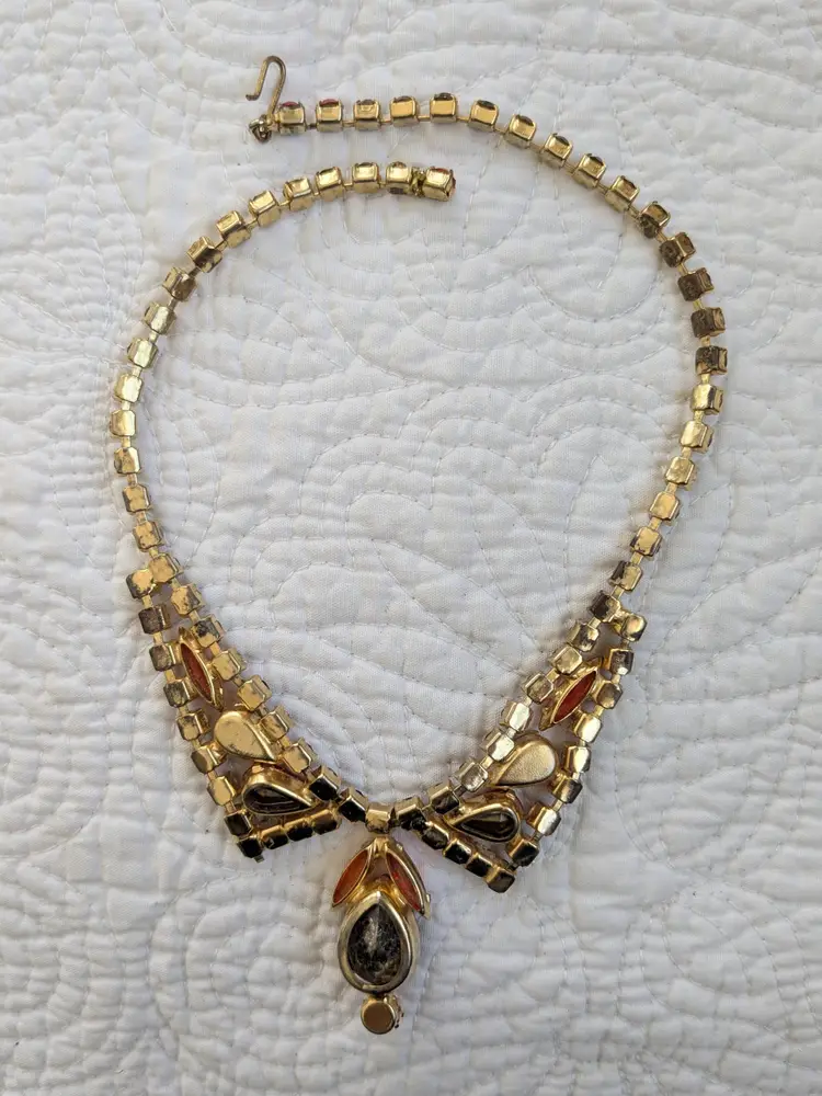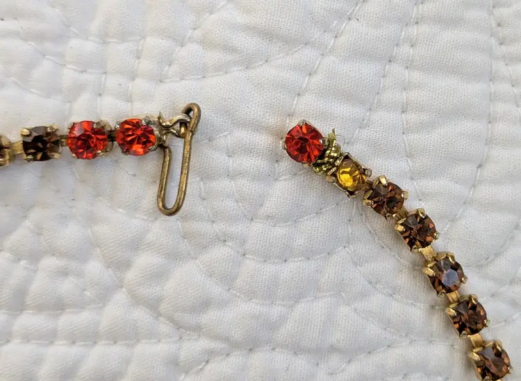 13-1/2" long. The hook end would be suitable for adding an extension chain. Note that one rhinestone (second from end) has been replaced. Unmarked
