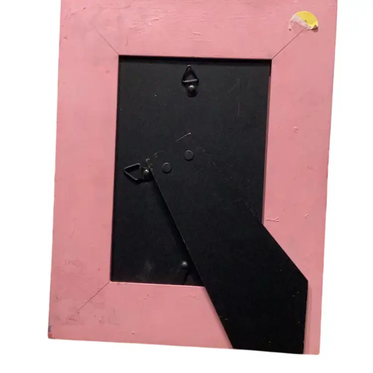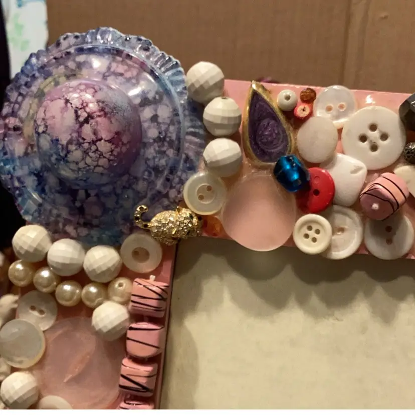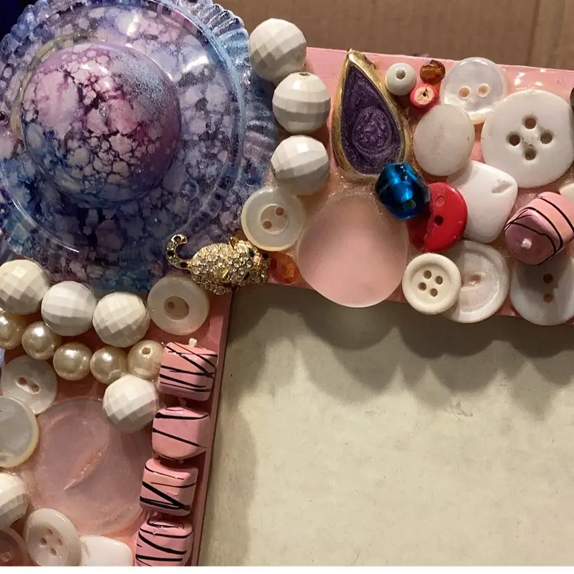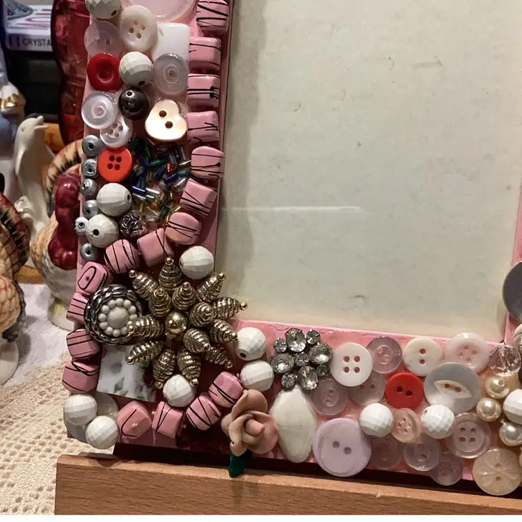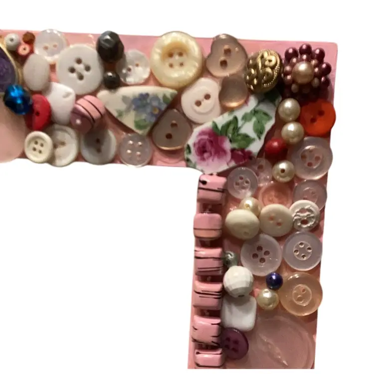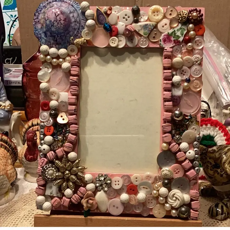 Handmade by me many years ago this measures approximately 9 1/2 X 7 1/2 inches would fit a 4 x 6 picture inside made with buttons up. Cycled picture frame can be hung on the wall or stood up on a table. Find the tiny little kitty cat.