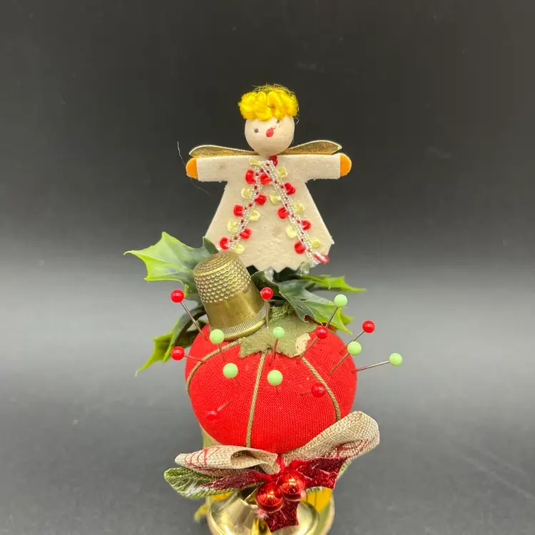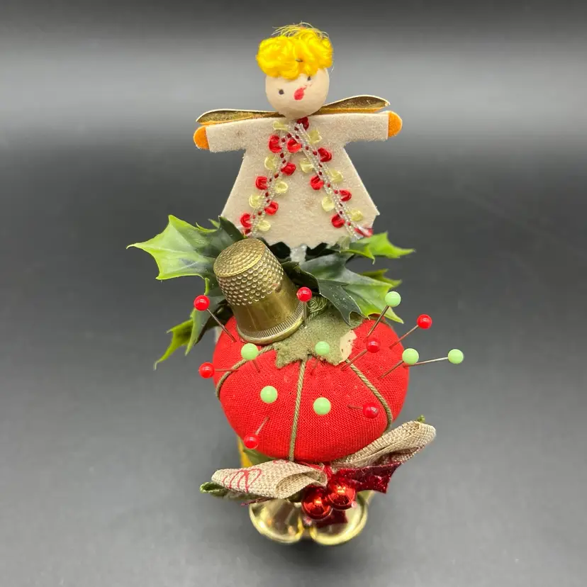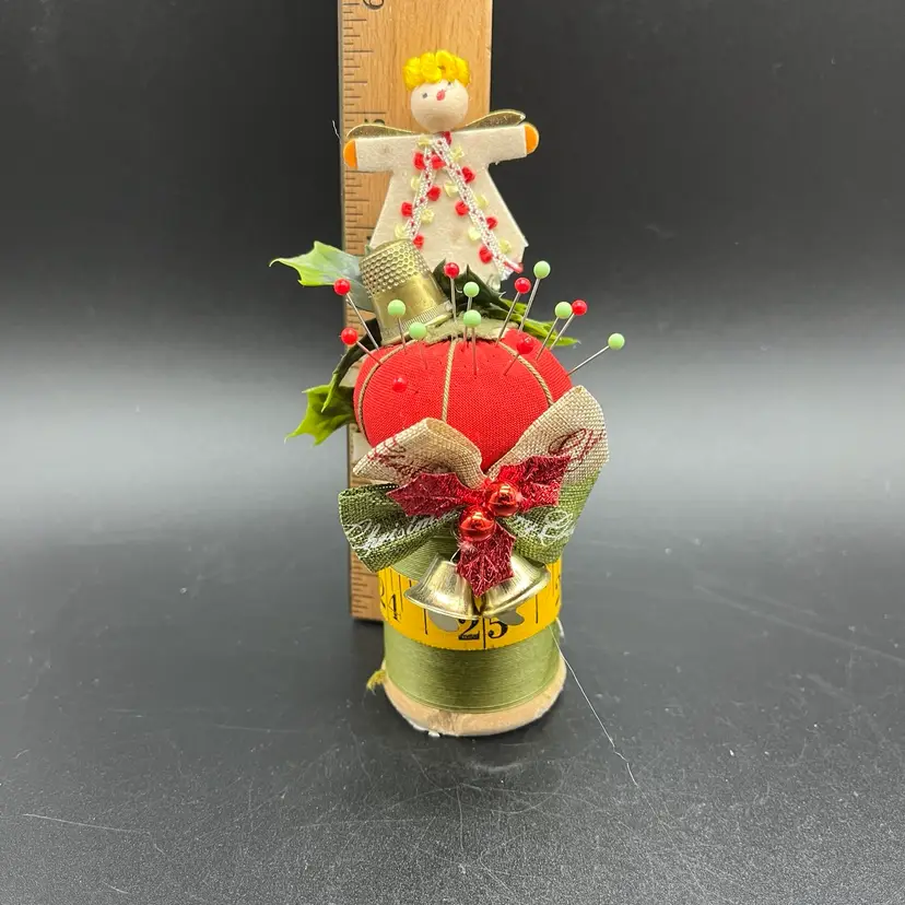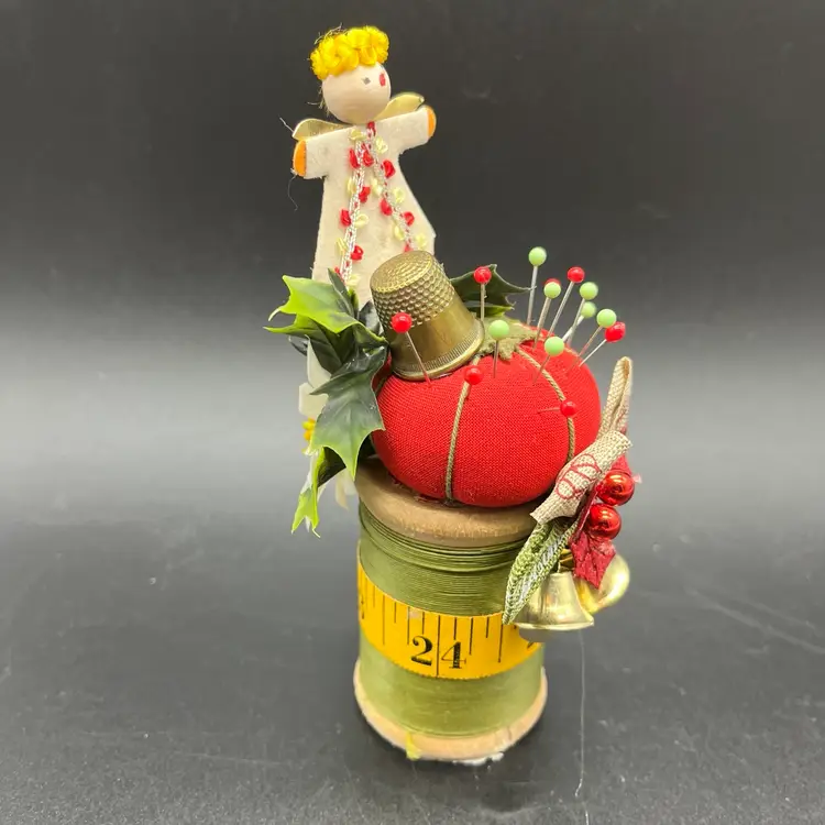 All Vintage items used to make this assemble vintage thread Vintage measuring tape, Vintage Christmas plastic Vintage pin cushion and angel