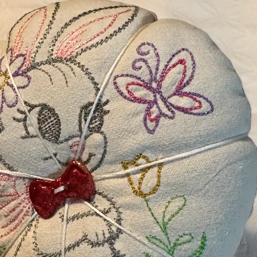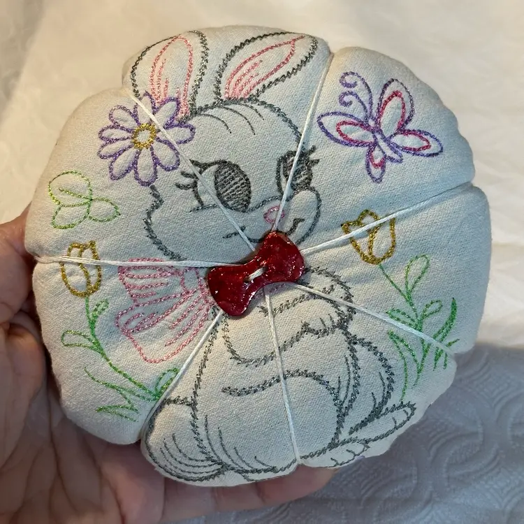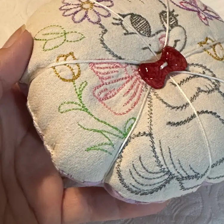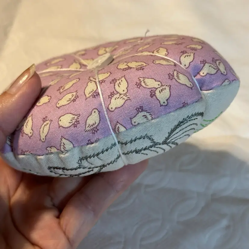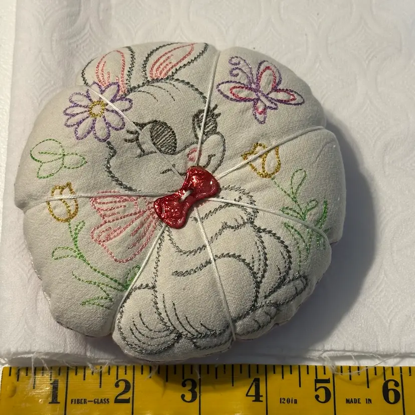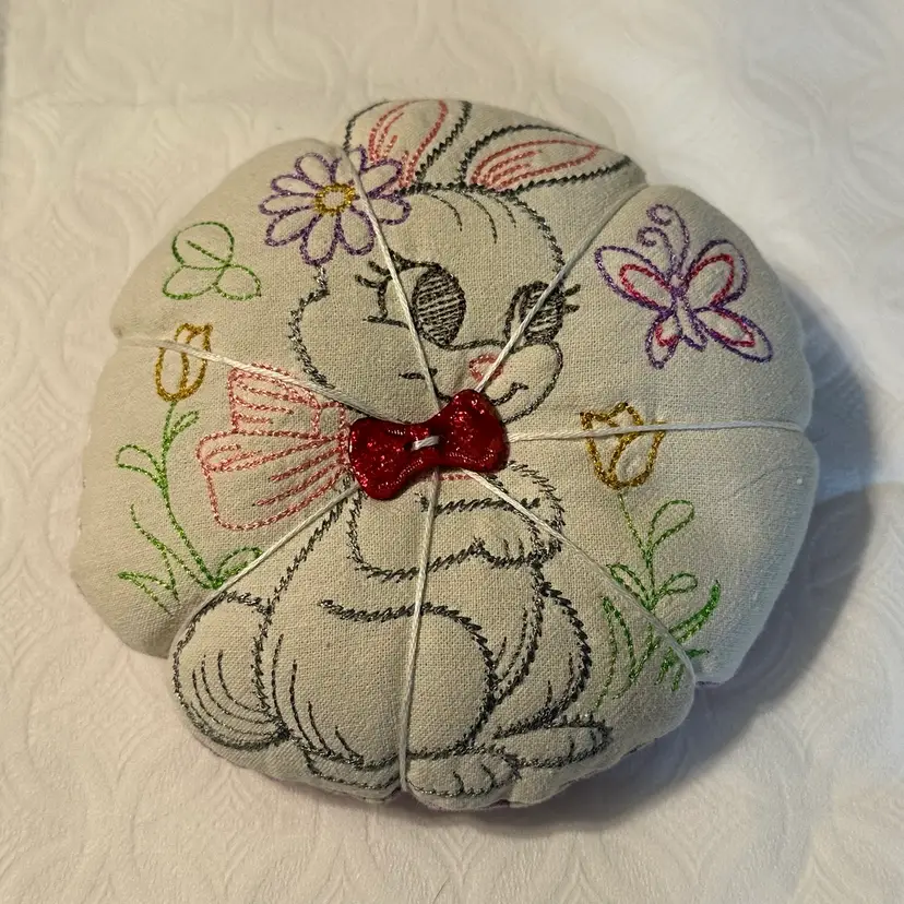 A cute pin cushion made with a vintage embroidered bunny linen, backed with 1930s reproduction feed sack. Feels like it may be a sand filling, or emery powder. Both are used in pin cushion making. Very nice condition.