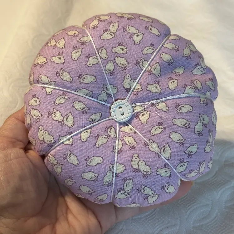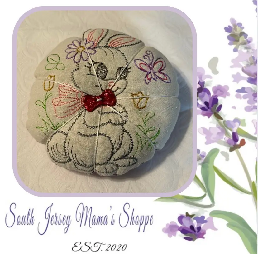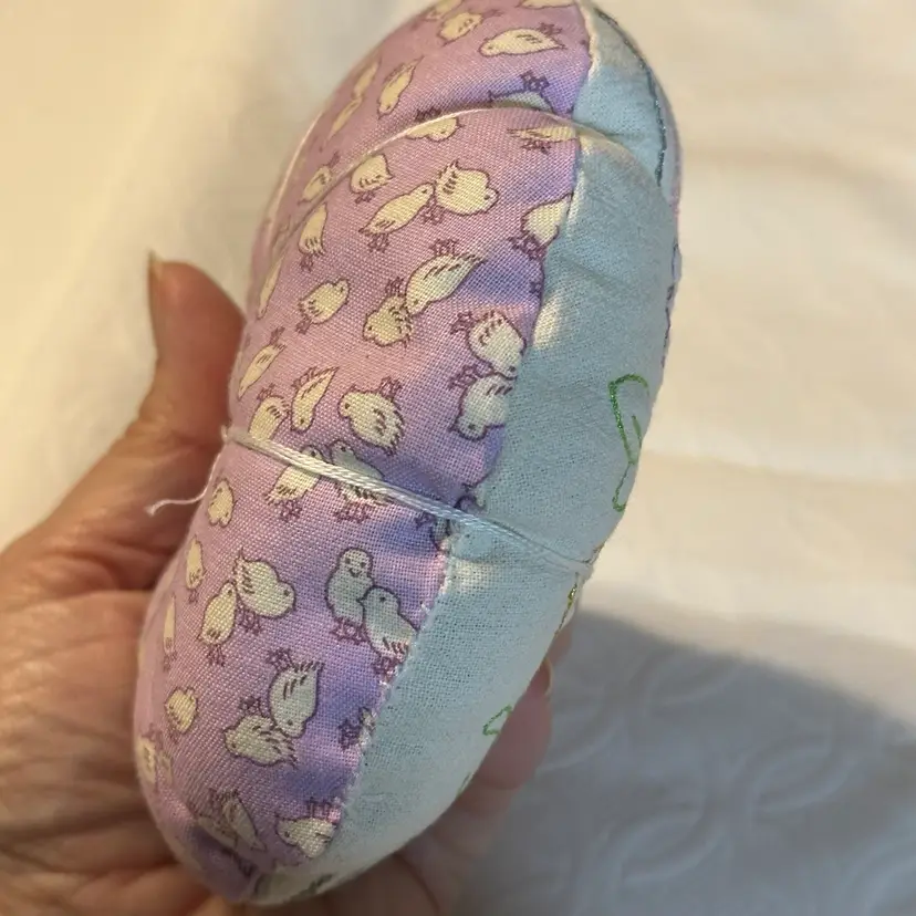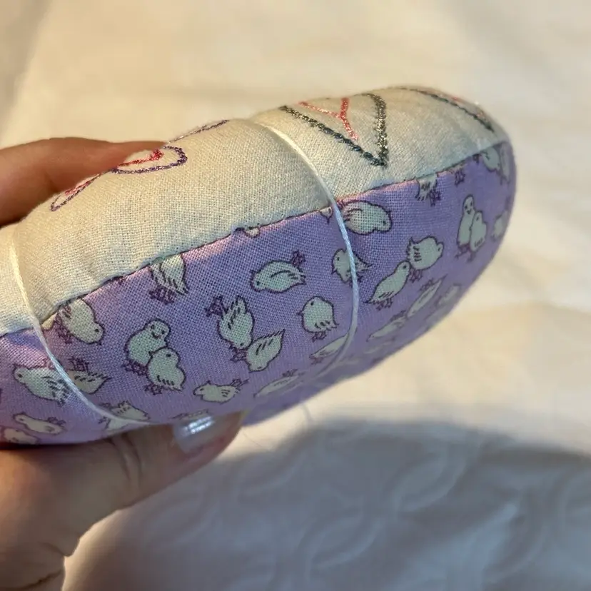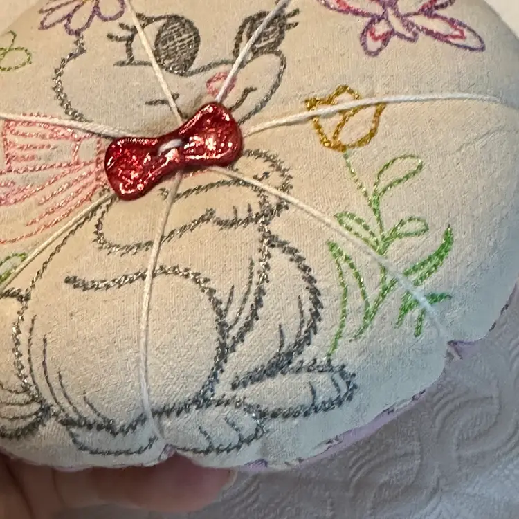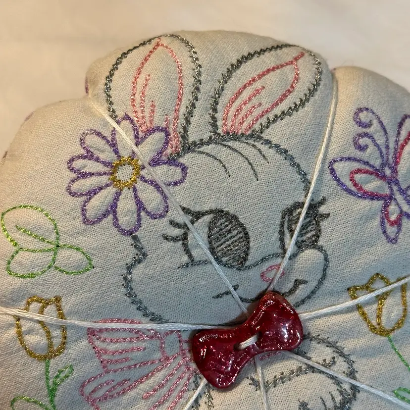 A cute pin cushion made with a vintage embroidered bunny linen, backed with 1930s reproduction feed sack. Feels like it may be a sand filling, or emery powder. Both are used in pin cushion making. Very nice condition.