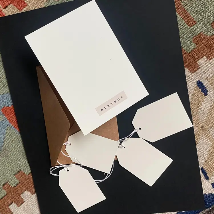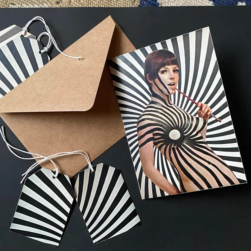 Upcycled, handmade and one of a kind greeting card and 4pc gift tag set made with original 1960s Playboy magazine clippings mounted to cardstock. The card has a model in body paint and a black and white psychedelic swirl pattern. The tags are cut from the same swirl pattern and are blank on the opposite side. The card is blank inside and branded Playboy on the back, and has a brown paper envelope.