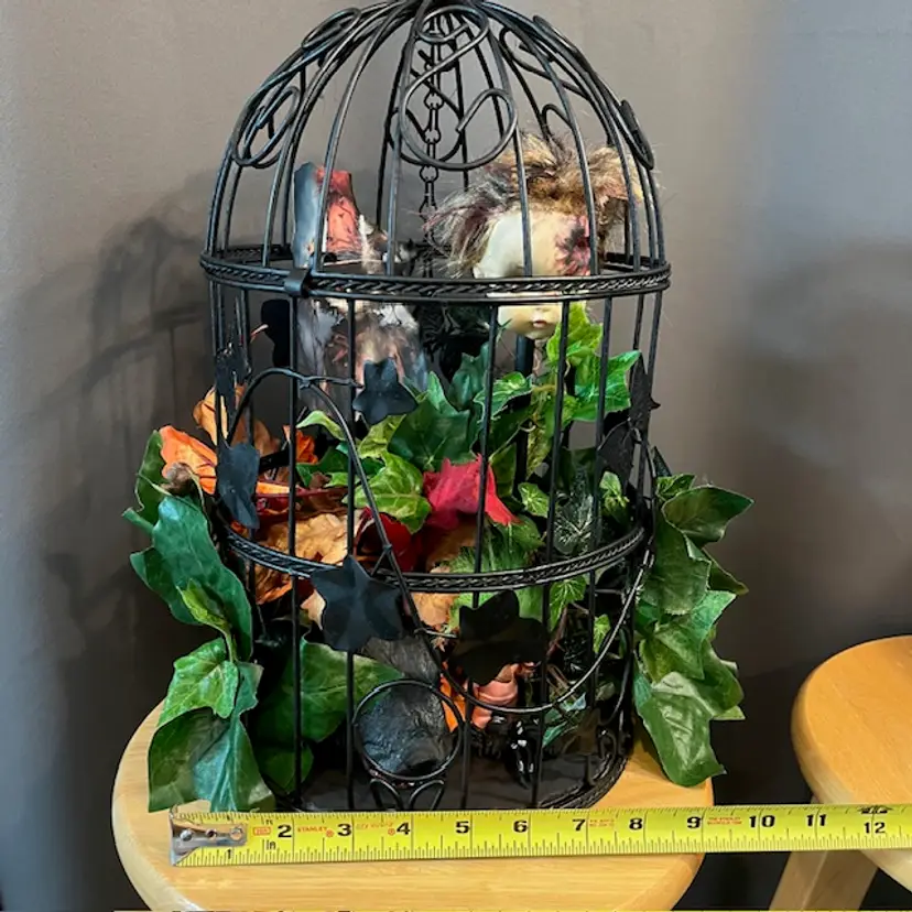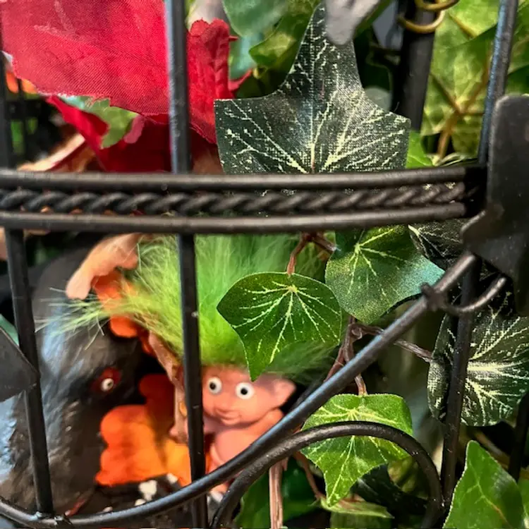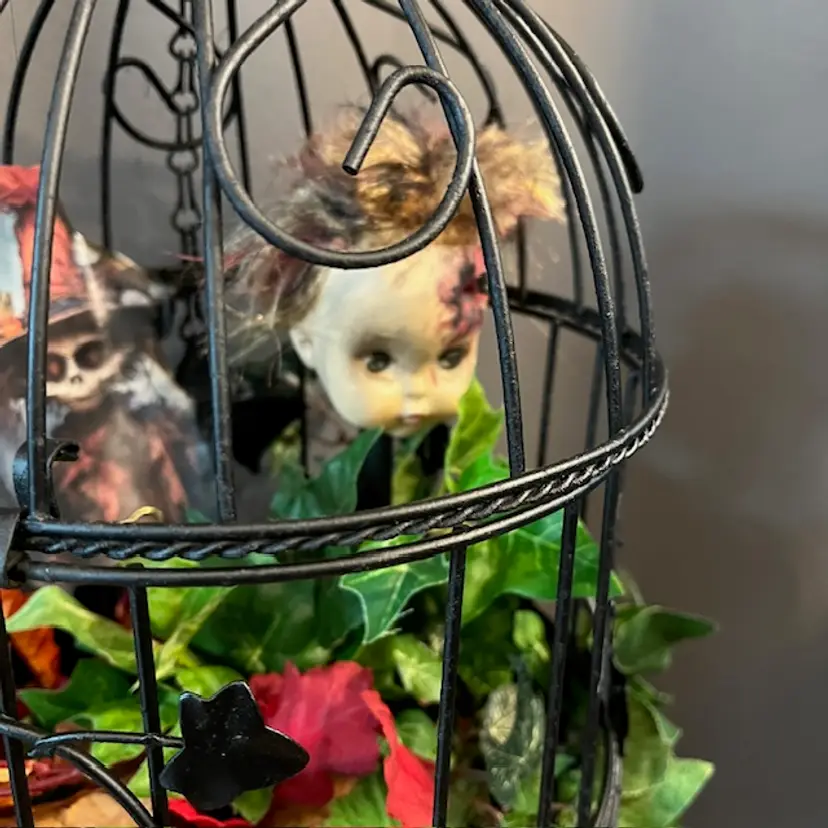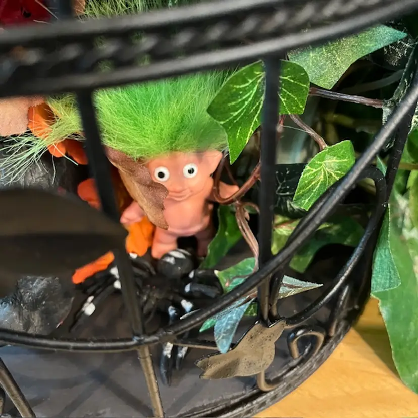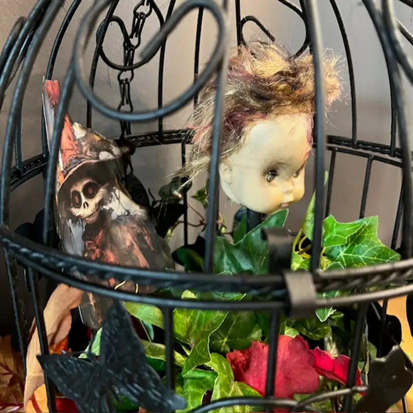 Repainted a vintage birdcage black, added creepy doll head on stick, green troll, spider and large rat. Hidden within the foliage.