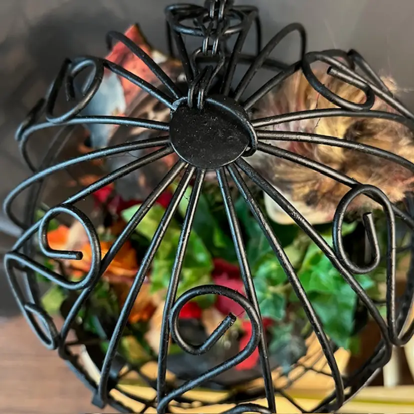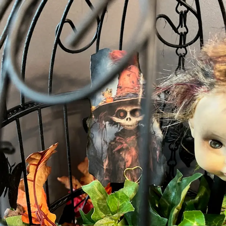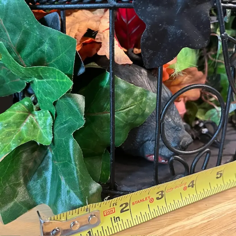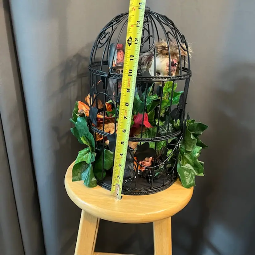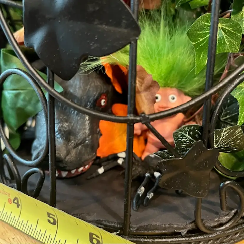 Repainted a vintage birdcage black, added creepy doll head on stick, green troll, spider and large rat. Hidden within the foliage.