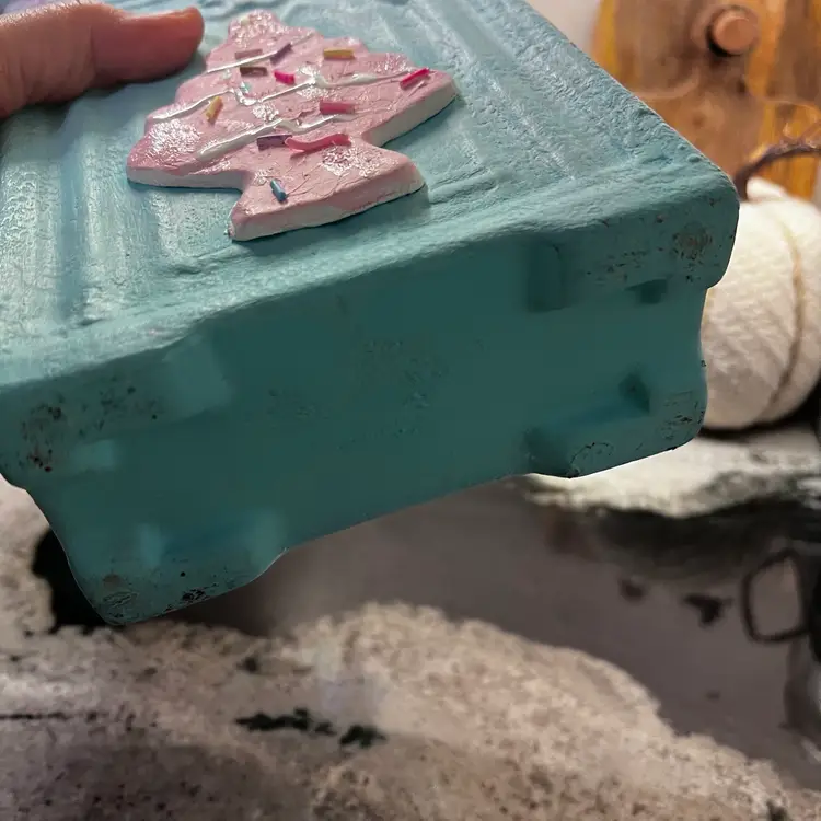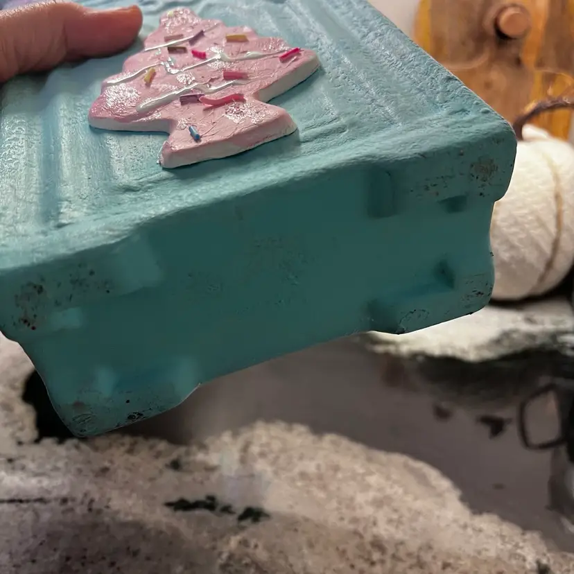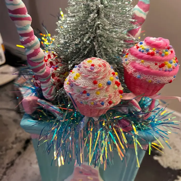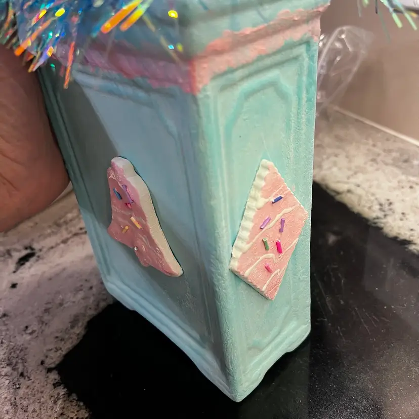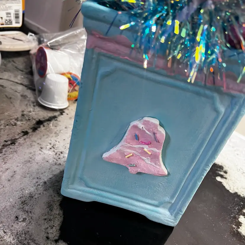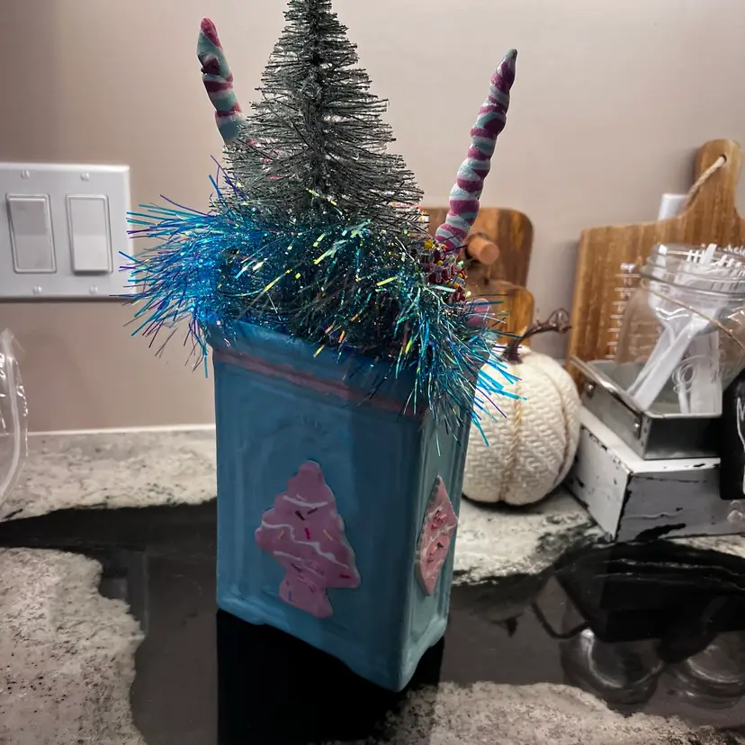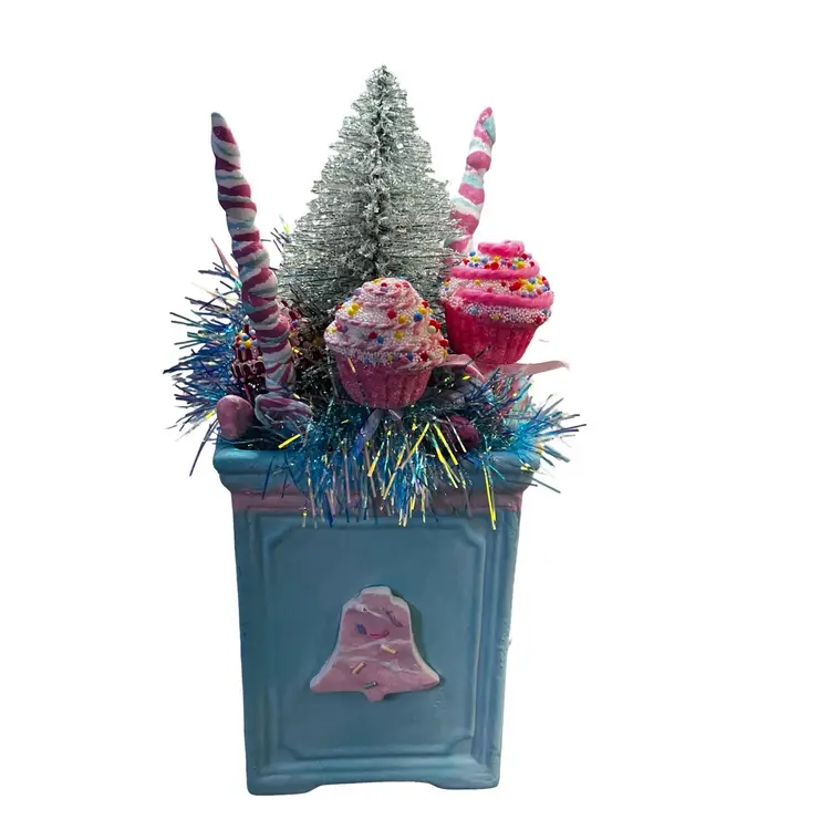 Approx 12” tall Hand painted I made the cookies and the candy myself The ceramic planter is vintage