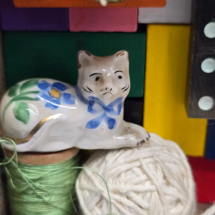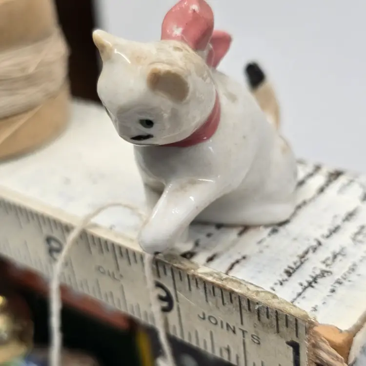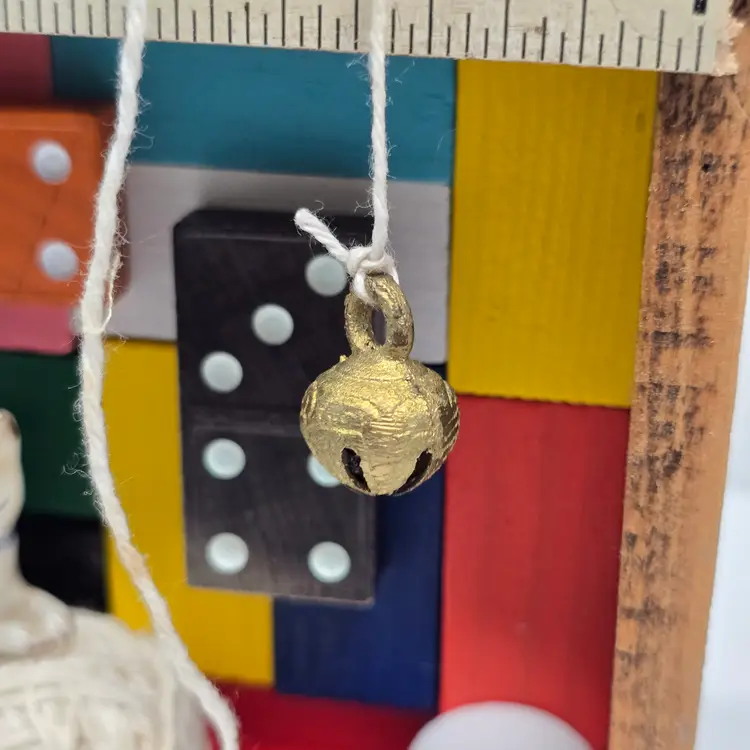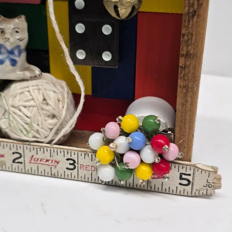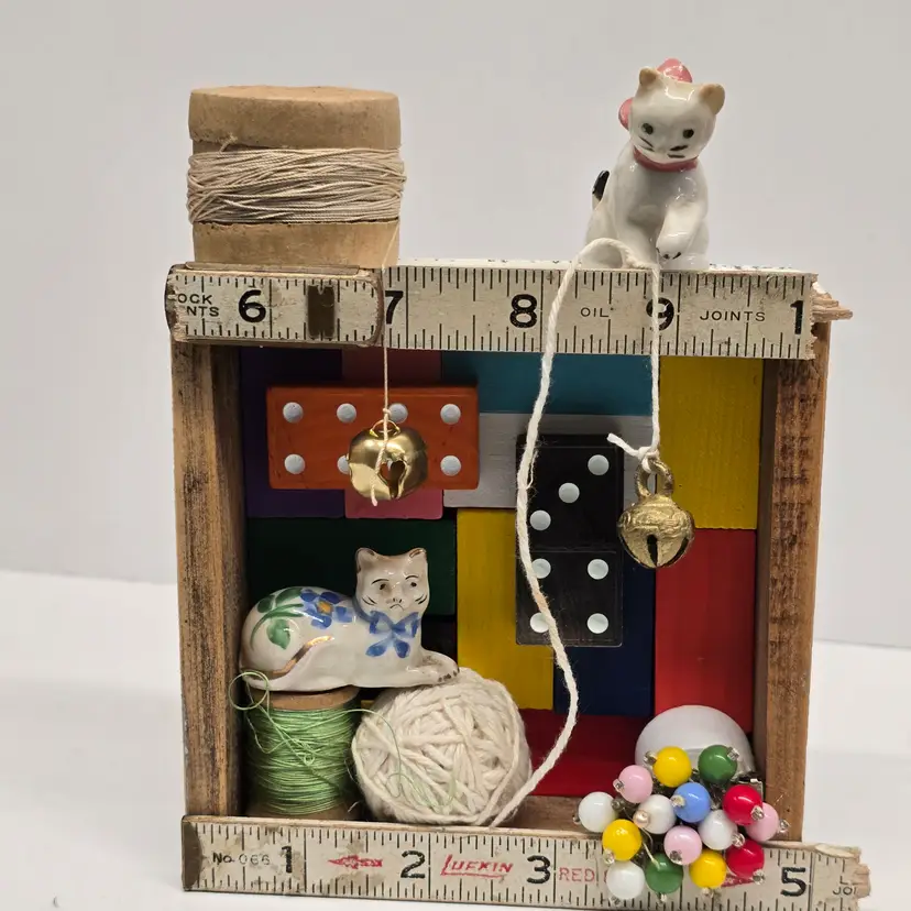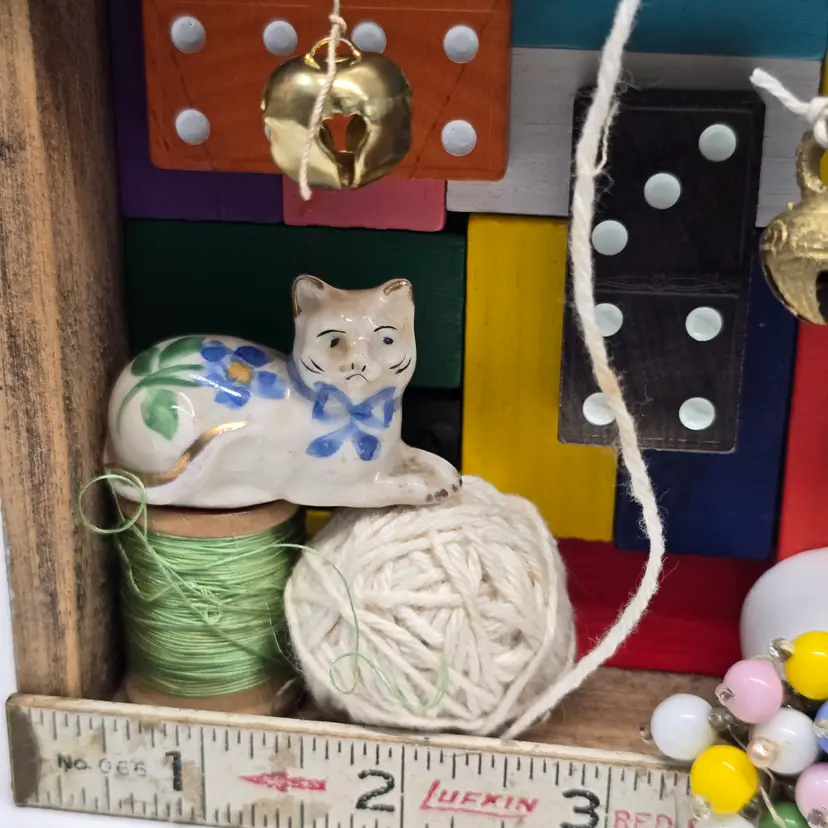 Here Kitty Kitty Upcycled Assemblage Art Shadowbox. Made using found objects and vintage Game Pieces.