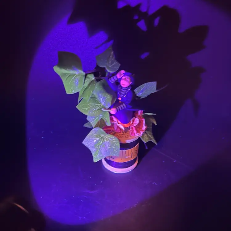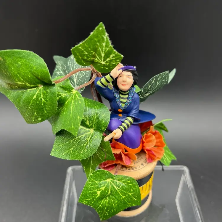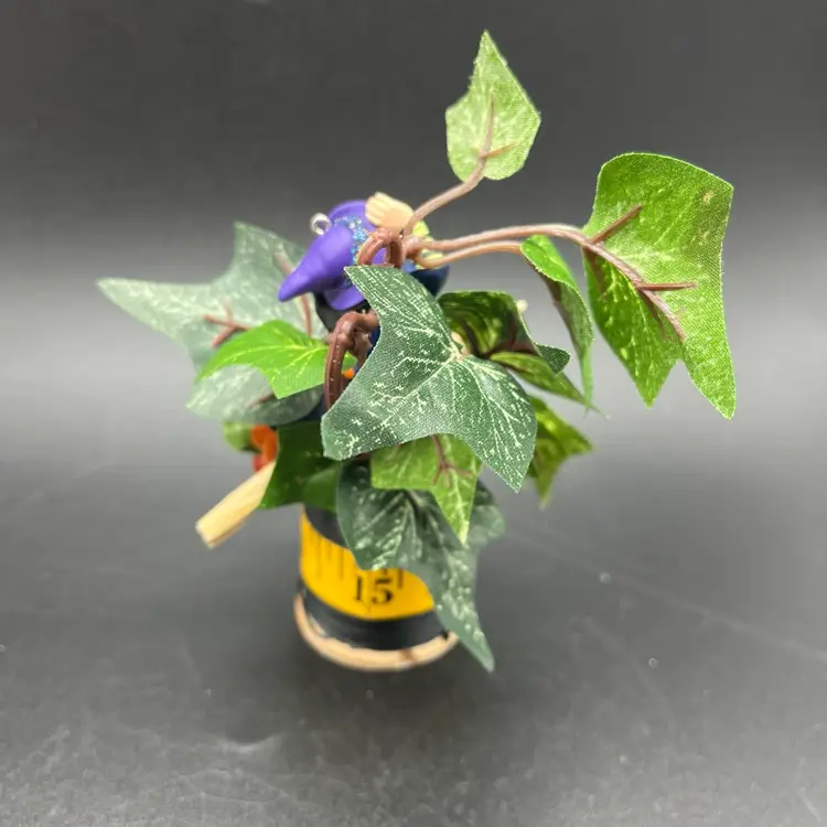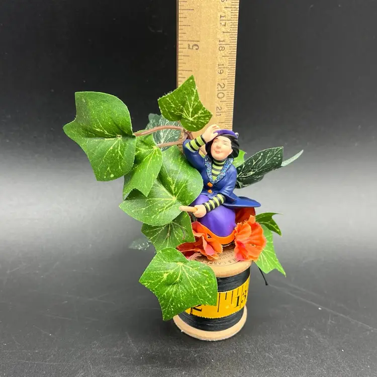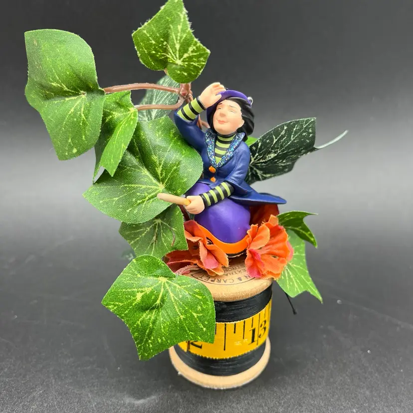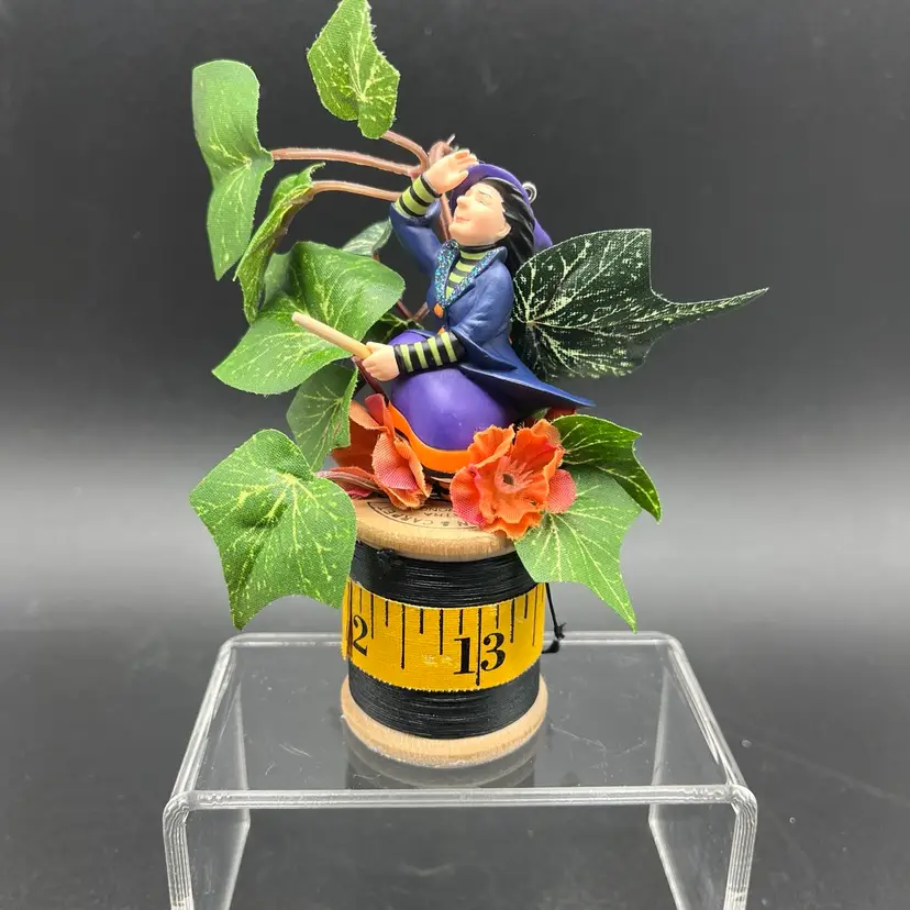 Vintage spool of thread upcycled for Halloween with Hallmark ornament and silk ivy/flowers