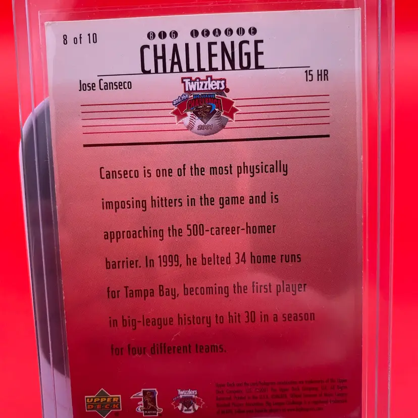 You are purchasing a pair of MLB Twizzlers Big League Challenge Insert Trading Cards from the 2001 Upper Deck line. This Listing includes one Gary Sheffield #6 and one Jose Canseco #8. These Cards are in overall good condition, see images for a closer look.