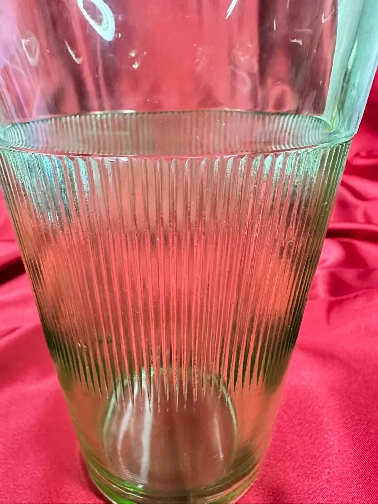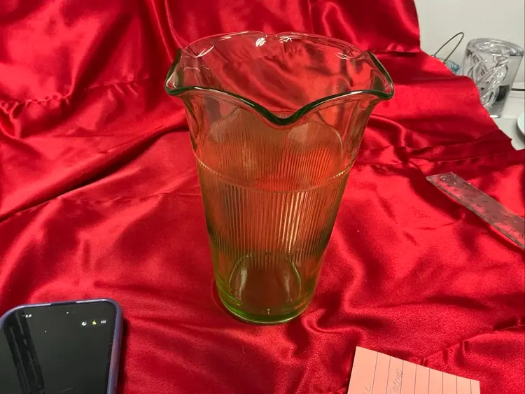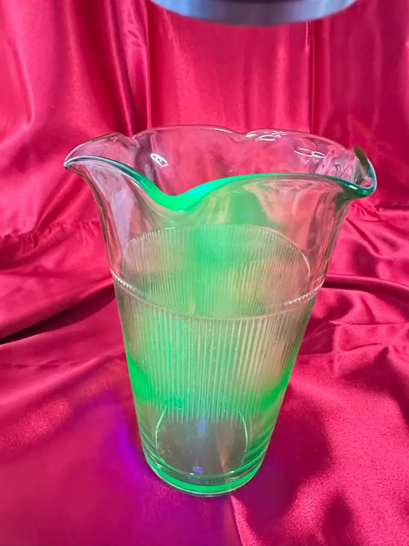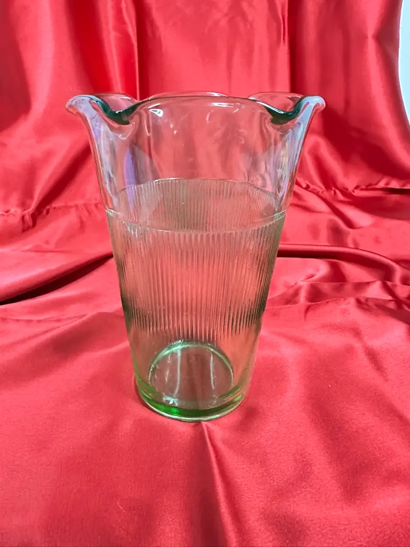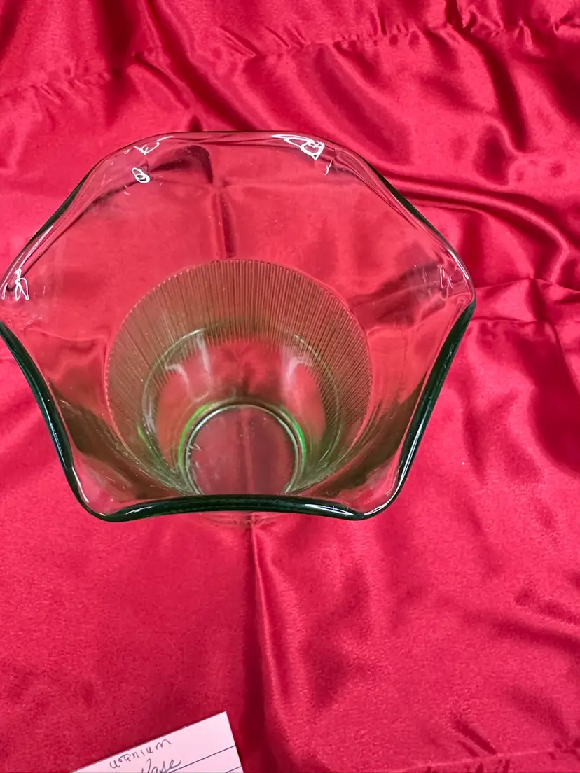 This 6.5 tall and 4.5 across the top. Has ribbed around the sides and ruffled edge. Excellent condition