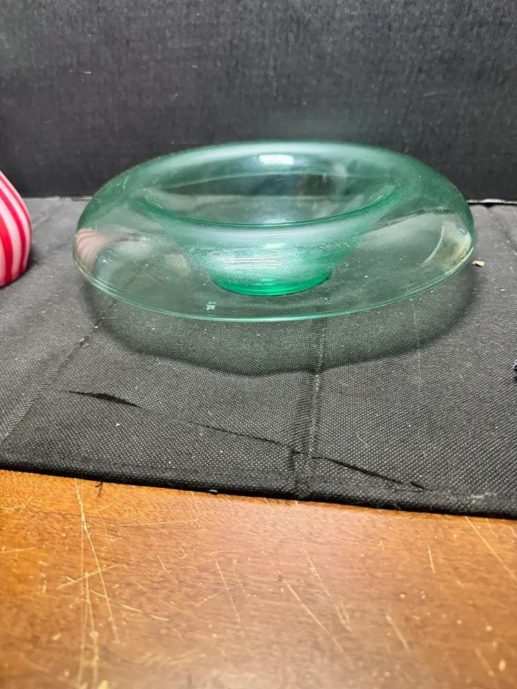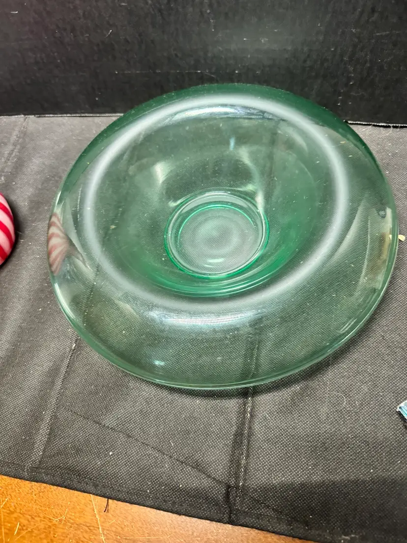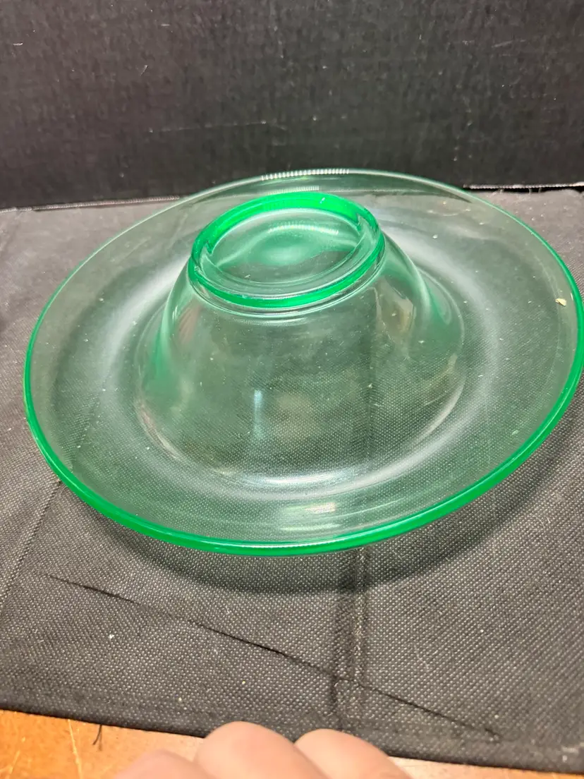 Mid century modern green uranium glass console bowl in great condition. Measures 11 inches across and 3 inches tall. Can be used as a table centerpiece or turned upside down as a chip and dip. Glows bright green under the black light, no chips or cracks.