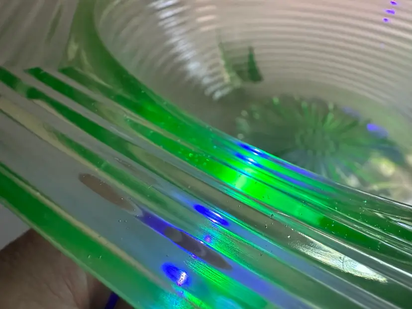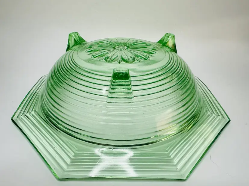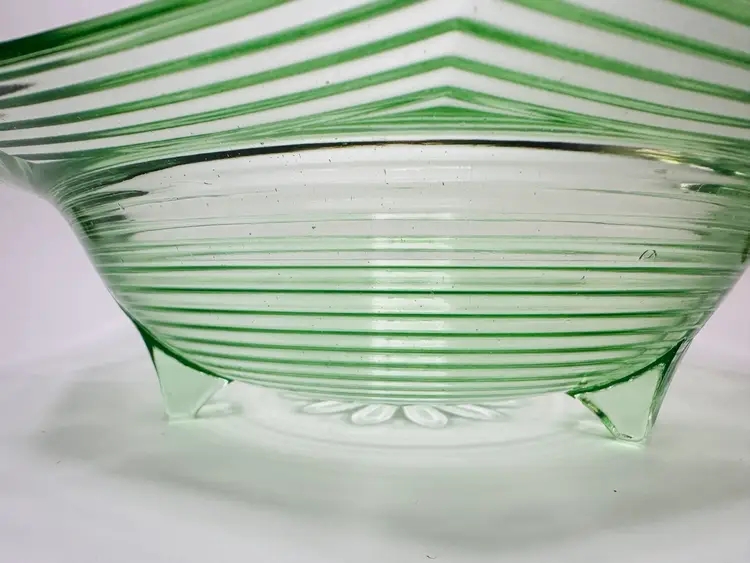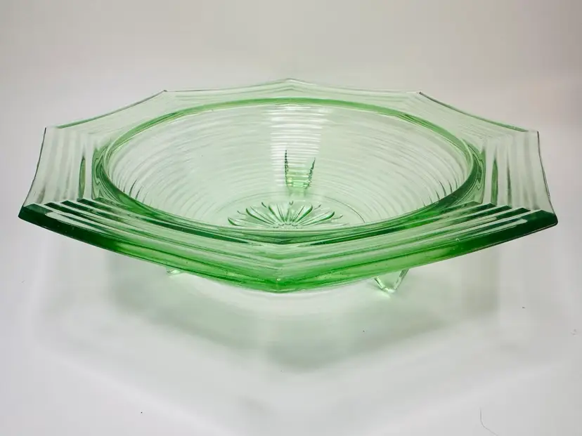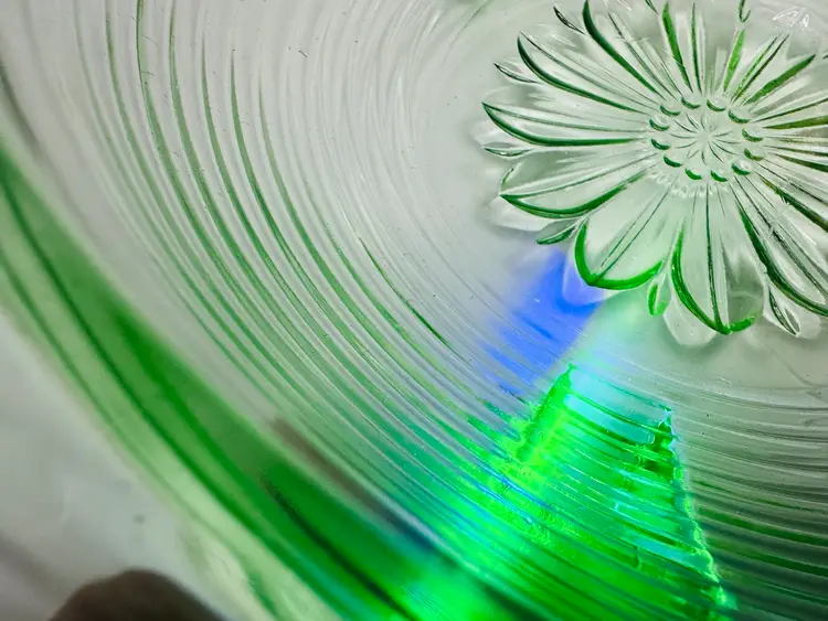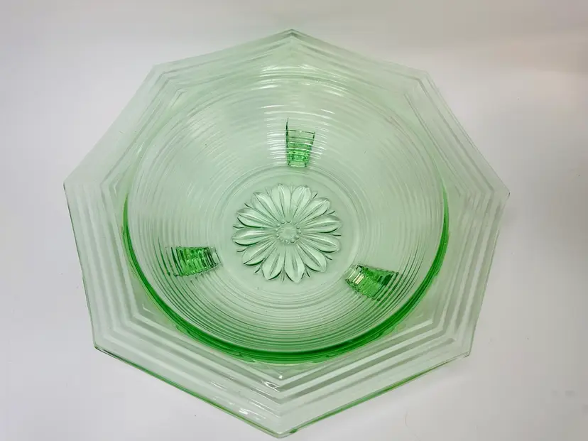 Pretty green glass console bowls. Has a flower covering the base. Glowing uranium glass. No chips, cracks, or scratches. 10 inches across, 3 inches tall.