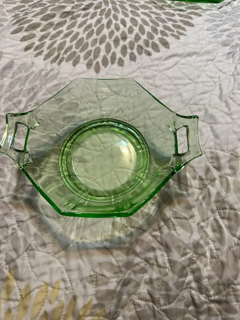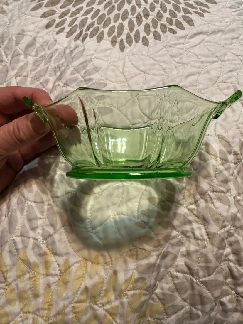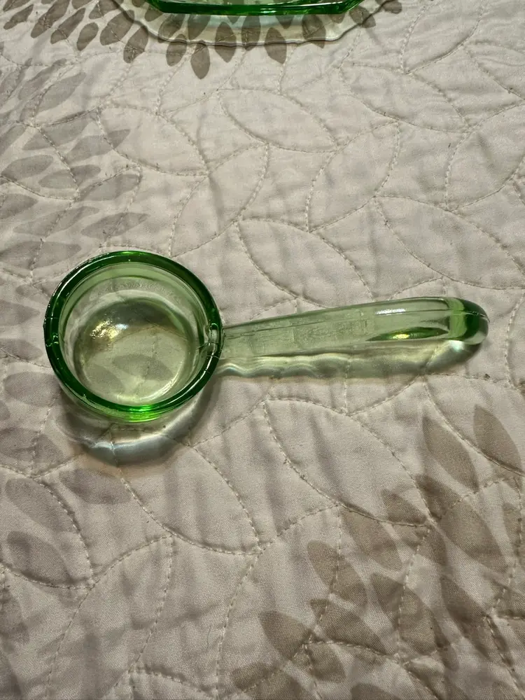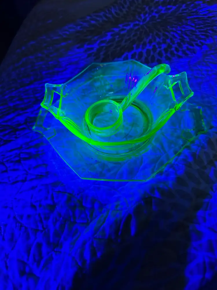 Glower!! I don’t know my glass makers, so 🤷🏻♂️. No damage noted. There’s a rough spot on the spoon that feels like the molding seam. Under plate is about 9” from handle to handle by 7 1/8” up and down. Bowl is 7” from handle to handle x 5.25” up and down x about 2.25” tall. Spoon is about 4.5” long.