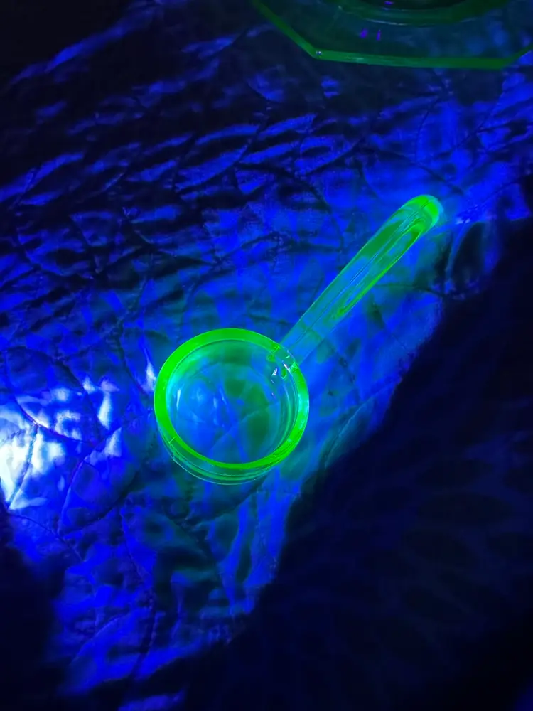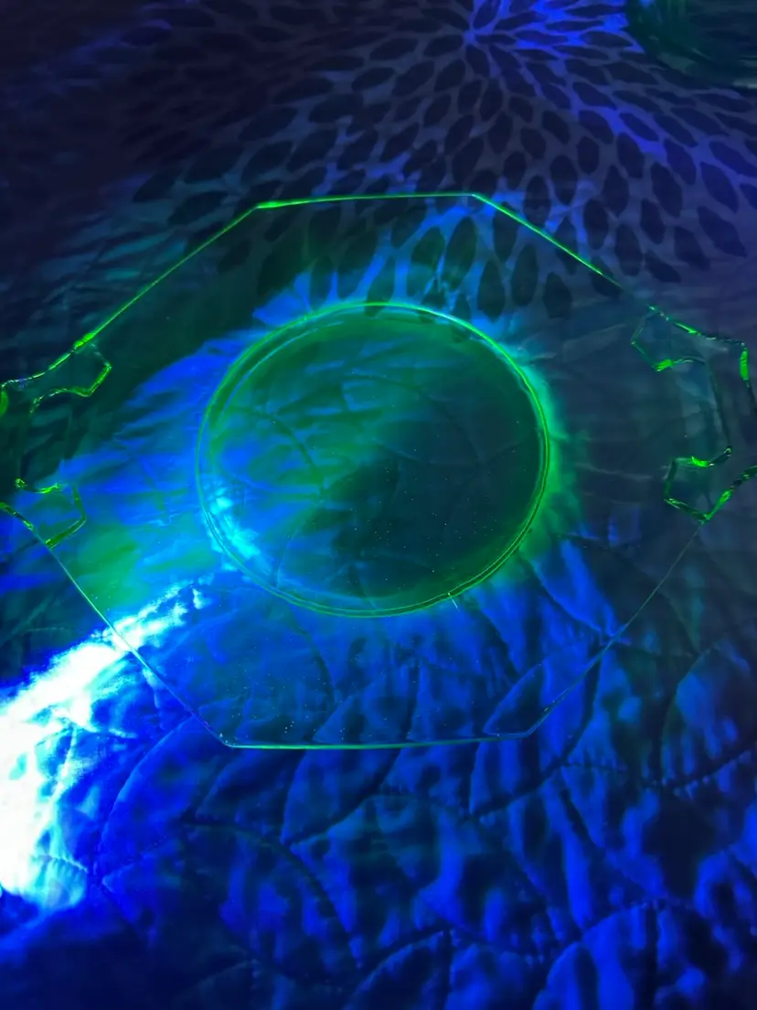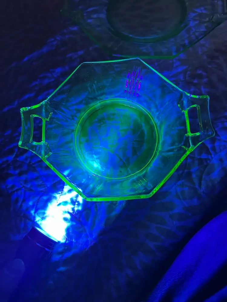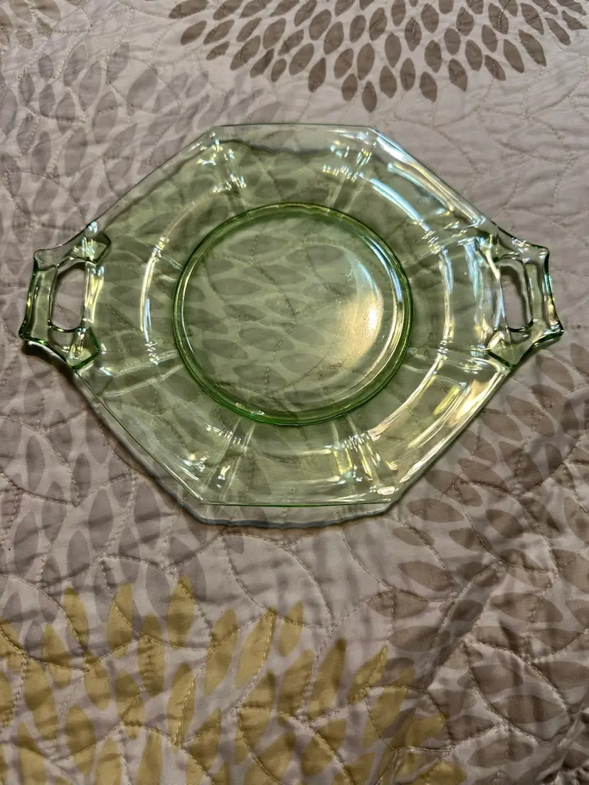 Glower!! I don’t know my glass makers, so 🤷🏻♂️. No damage noted. There’s a rough spot on the spoon that feels like the molding seam. Under plate is about 9” from handle to handle by 7 1/8” up and down. Bowl is 7” from handle to handle x 5.25” up and down x about 2.25” tall. Spoon is about 4.5” long.