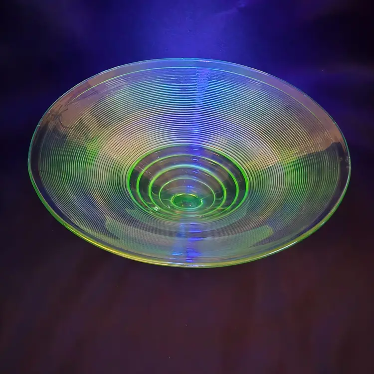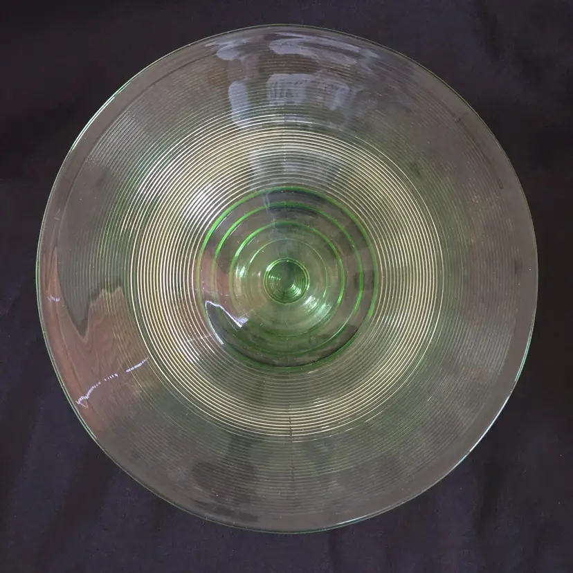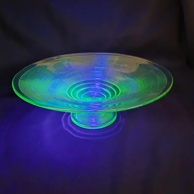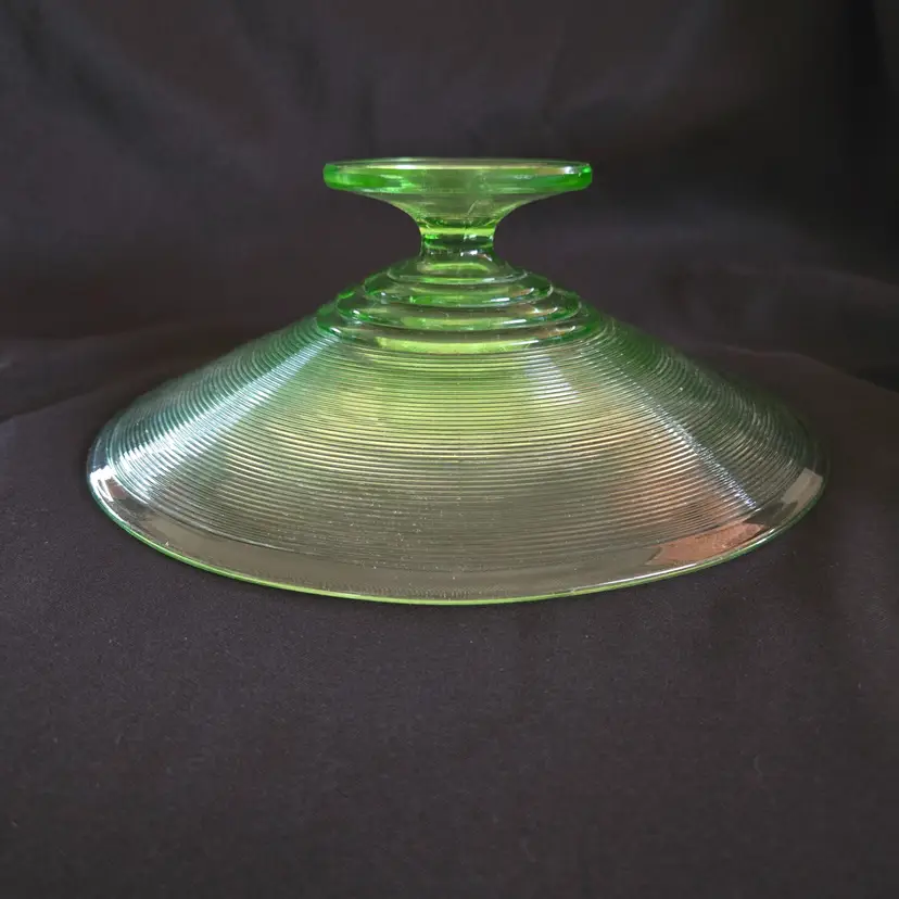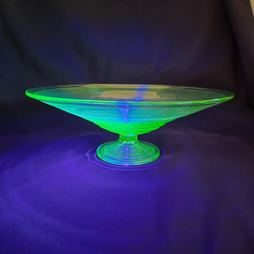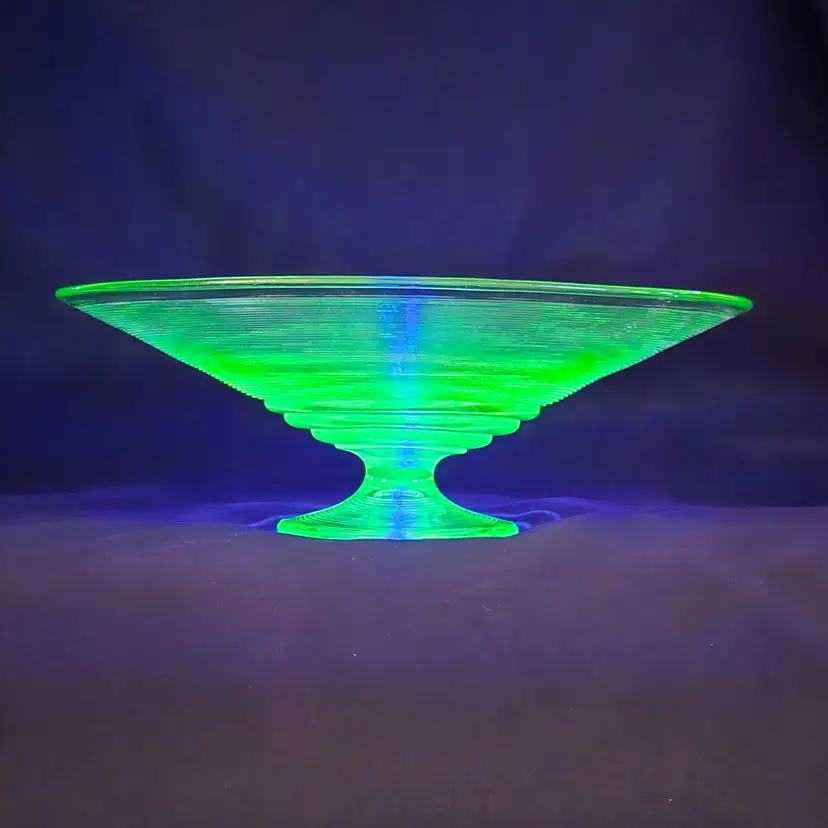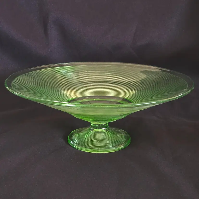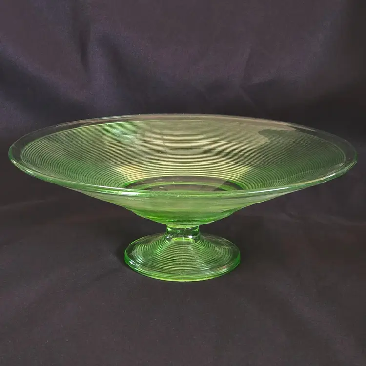 Uranium Vaseline Ribbed Console Fruit Centerpiece Foot Bowl Glowy 1920s Antique. Used condition with some dirt/dust within the ridges, manufacturer flaws with rough edge. Please view all the photos and please ask any questions prior to purchase when possible. 10¾ inch diameter.