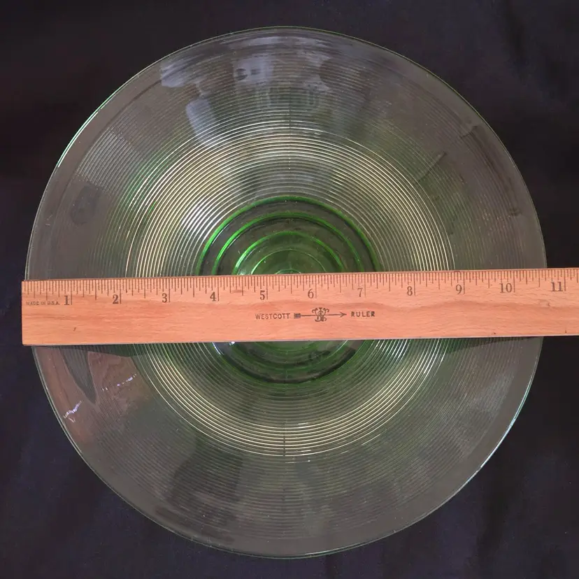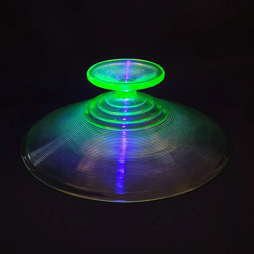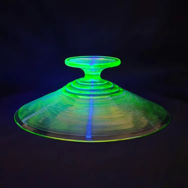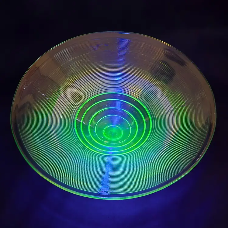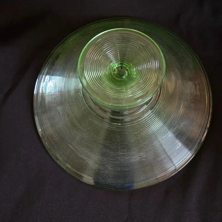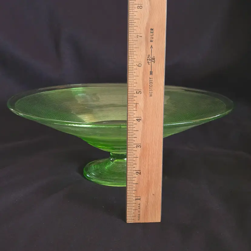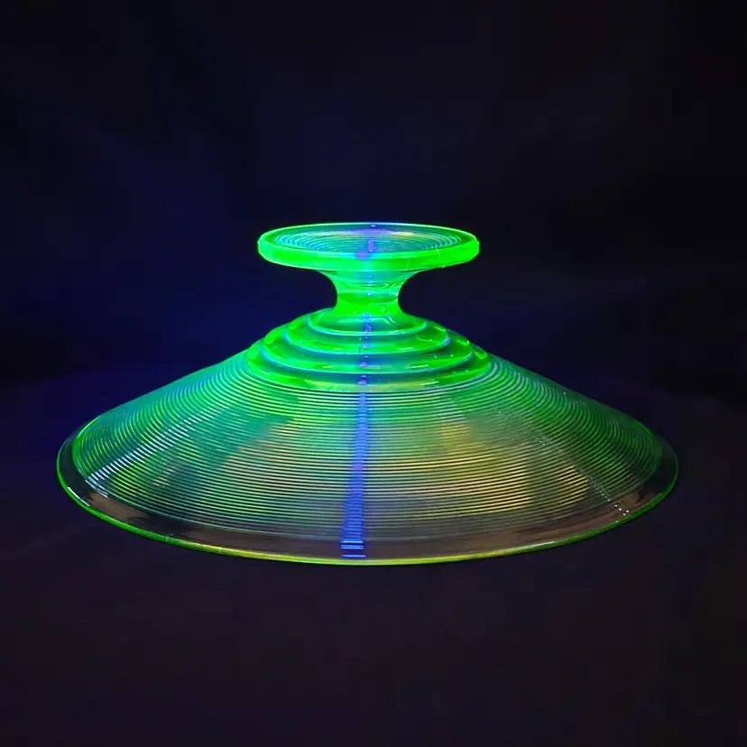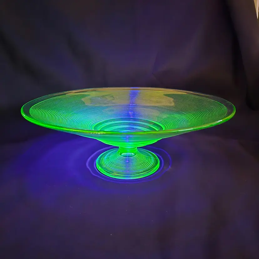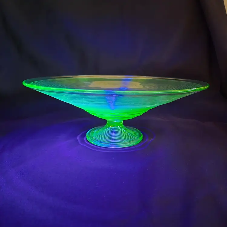 Uranium Vaseline Ribbed Console Fruit Centerpiece Foot Bowl Glowy 1920s Antique. Used condition with some dirt/dust within the ridges, manufacturer flaws with rough edge. Please view all the photos and please ask any questions prior to purchase when possible. 10¾ inch diameter.