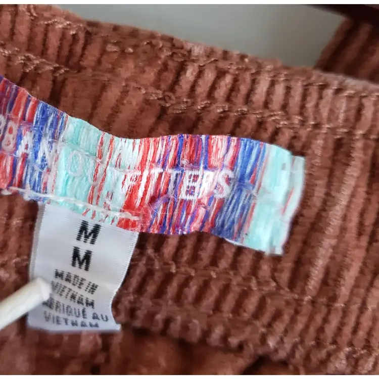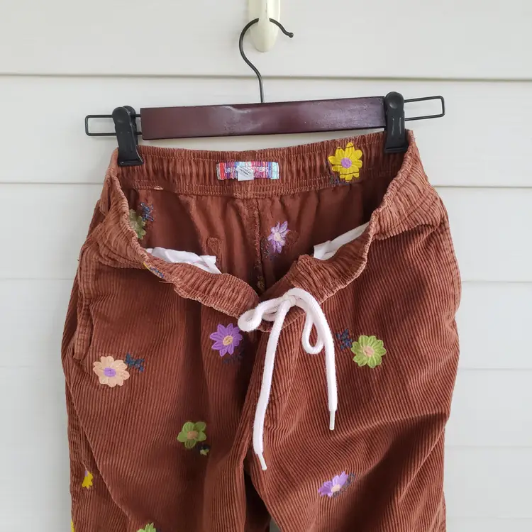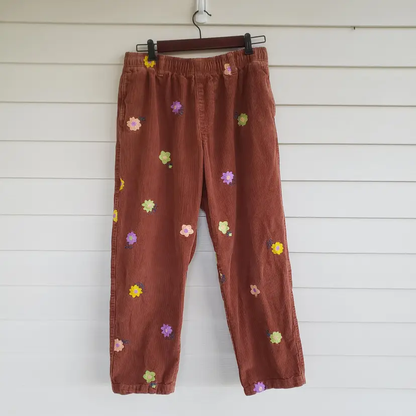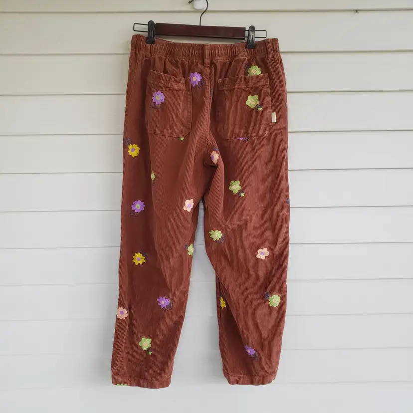 Great pair of brown Corduroy pants from Urban Outfitters that are covered in small embroidered flowers. They are tagged a size Medium but will fit up to a Large because of the elastic waist. There is both elastic in the waist and a string tie. Pants also have beltloops and deep side pockets. Material is 100% Cotton except for the embroidery thread which is 100% Polyester. Machine washable. Notice the length of the legs is slightly cropped at 27". Pants have a slight baggy fit. They are in nice condition.