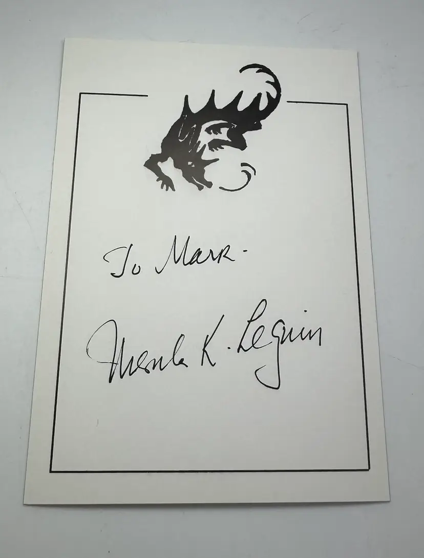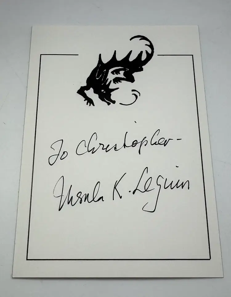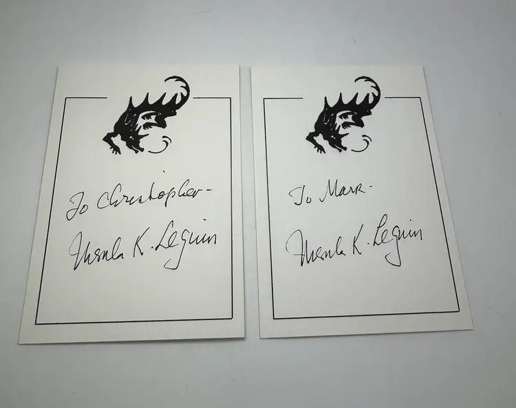 •• Two Signed Bookplates: Featuring Ursula K. Le Guin’s signature and her iconic dragon/creature emblem. -One is inscribed "To Mark," and the other "To Christopher." -The bookplates are currently loose/unattached