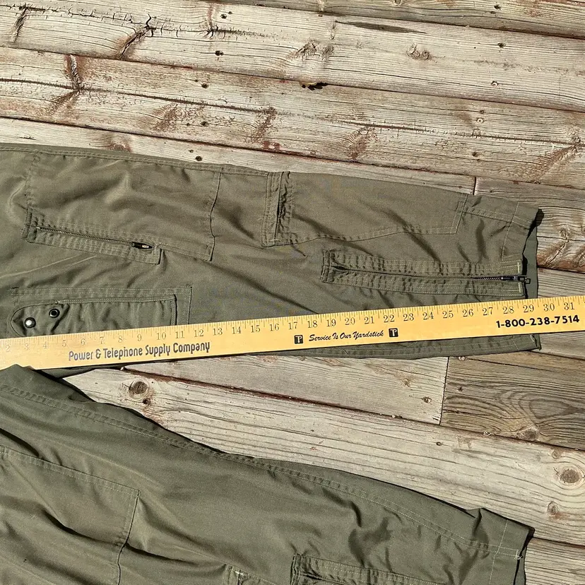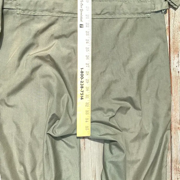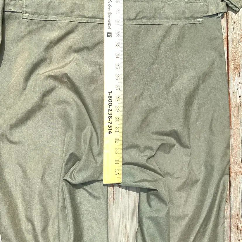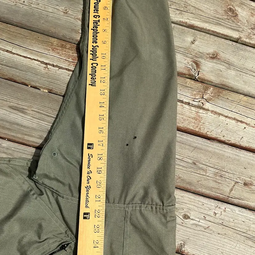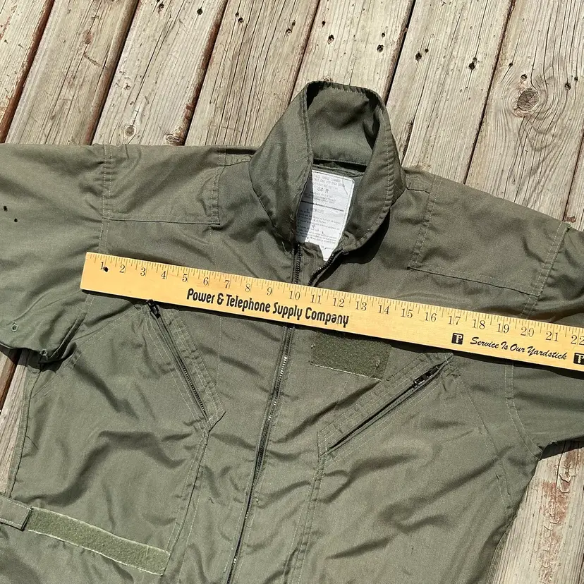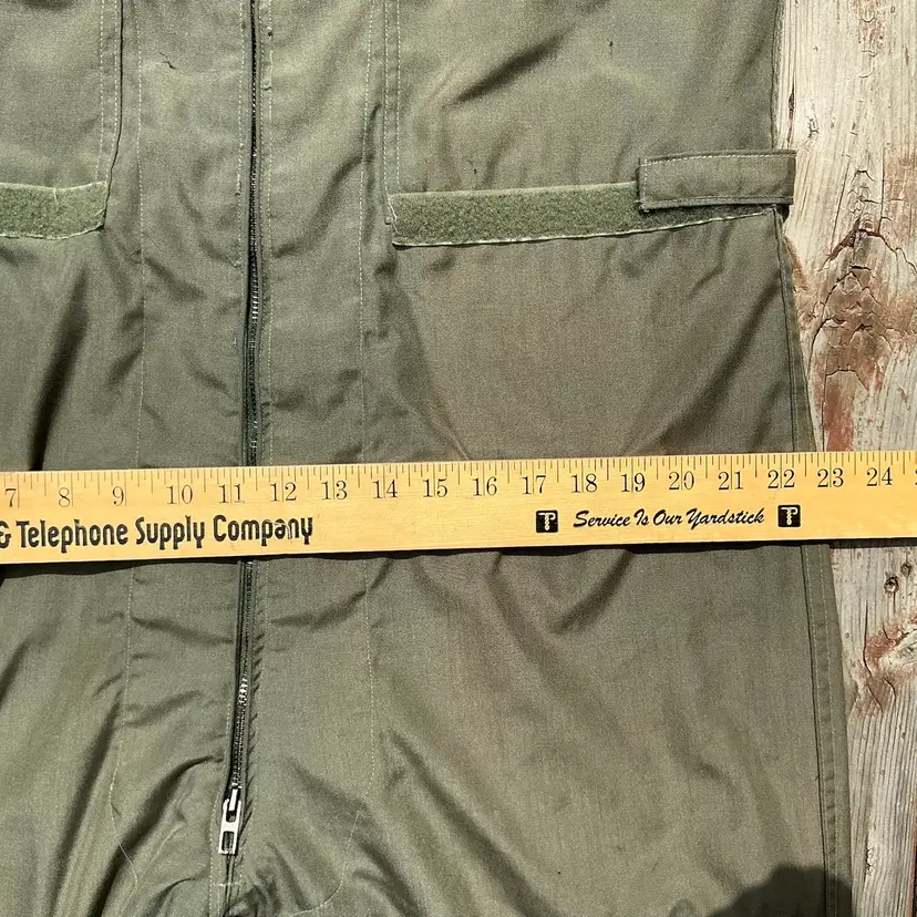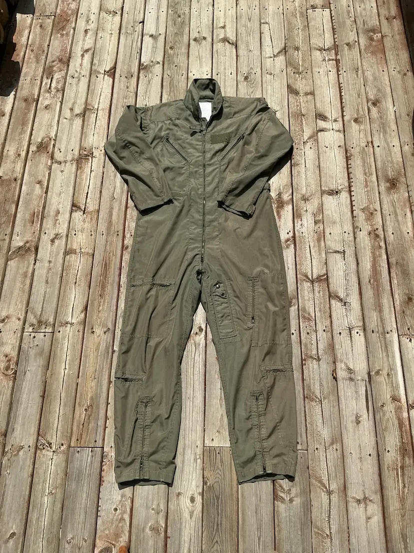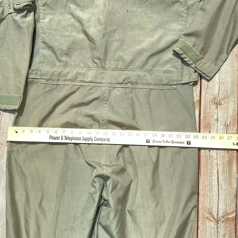 Authentic US Military CWU-27/P Sage Green Flight Suit in size 44R. Made from aramid/polyamide fabric, this coverall is fire resistant, designed for summer wear. Features multiple zip and snap pockets for utility, a full front zipper, and adjustable waist and cuffs. Condition: Pre-owned, excellent overall condition with two small burn marks on the right arm (see photos). Perfect for military collectors, aviation enthusiasts, or cosplay/costume use. • Color: Sage Green • Size: 44 Regular (see measurements in photos) • Material: Aramid/Polyamide (flame resistant) • Contract No: 9010-91 • NSN: 8415-01-043-8392