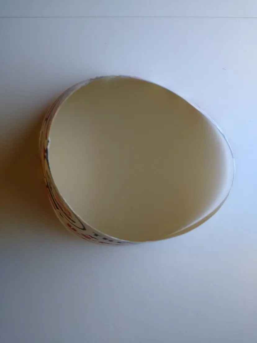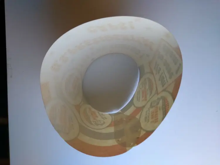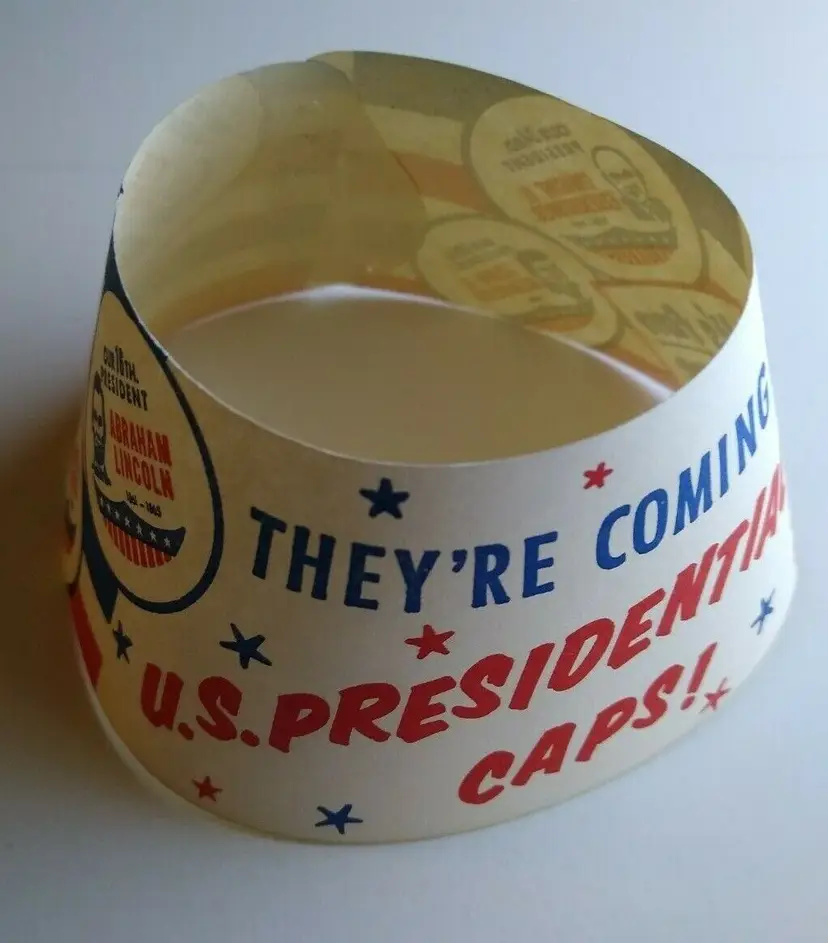 Super cool graphics on this 3.75" x 2.25" round unused new old stock condition milk bottle paper collar with U.S. presidents bottle caps advertising. Has slight age wear only. Inside has formed tabs that have been attached to make item cone shaped. Slightly out of shape from storage.