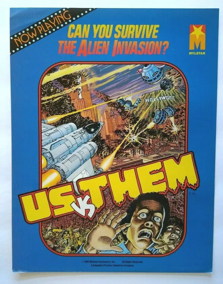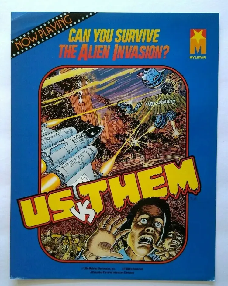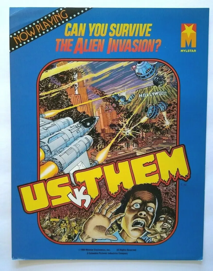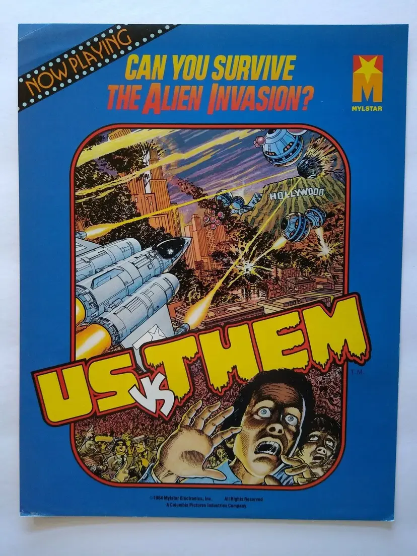 Arcade: Flyer Theme: Science Fiction Modified Item: No Country/Region of Manufacture: United States Original/Reproduction: Original Subject: Aliens Year: 1984 Game Title: Us vs Them Brand: Gottlieb