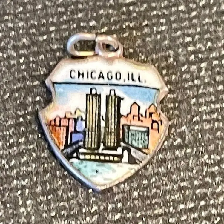 Shield Charm - Chicago Illinois Marina Towers Souvenir Vintage Enamel Travel Charm - Sterling Silver